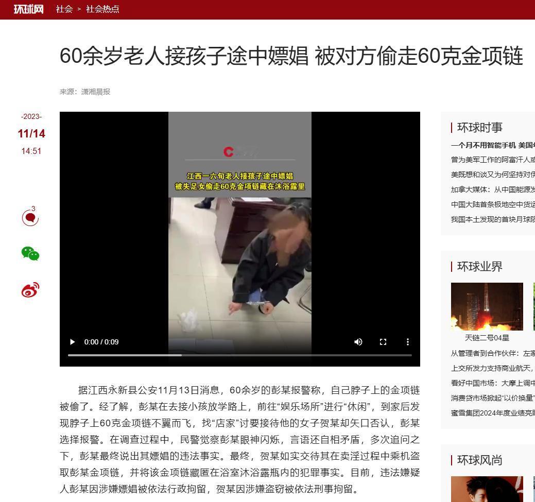 江西吉安,60岁大爷接孙子时去早了,就趁空档去嫖娼。结果失足女不讲武德,把大爷脖子上的金项链给偷走了!但大爷找失足女索要,失足女却坚决否认!大爷气不过,豁出老脸也要报案拿回项链,结果伤敌一千自损八百! 这位大爷姓彭,今年六十出头,早年靠着自己的打拼经商致富,攒下了不少家底。 如今儿女们接手了生意,彭大爷便退居二线,平日里在家操持家务,最主要的任务就是每天按时接送孙子上下学,日子过得也算安稳惬意。 彭大爷脖子上,常年戴着一条六十克重的足金项链,这条项链不只是一件饰品,更是他和老伴结婚三十周年的纪念品,对他来说意义非凡,多年来从未离身。 随着年纪增长,彭大爷的老伴对夫妻间的亲密相处渐渐没了兴趣,这让常年闲赋在家的彭大爷心里多了几分寂寞,也渐渐生出了一些不切实际的念头。 他偶然听人提起,孙子学校附近的一栋陈旧居民楼里,有一位姓贺的女子在从事非法卖淫活动,只是一直没敢付诸行动。 事发那天下午,彭大爷像往常一样提前出门去接孙子,可到了学校门口一看时间,距离放学还有整整一个小时。 看着校门口冷冷清清的街道,彭大爷心里的那点歪心思又冒了出来,一时冲动之下,他朝着那栋传说中有特殊服务的居民楼走了过去。 这栋楼就在学校隔壁的小巷里,十分隐蔽,贺某的住处设在三楼,门口没有任何标志,房间里拉着泛黄的窗帘,显得格外昏暗压抑。 彭大爷敲开房门,见到了贺某,两人简单交谈几句,就谈好了交易价格。 彭大爷此刻早已按捺不住,迫不及待地想要宽衣解带,而贺某虽然常年从事这类违法活动,面对比自己年长几十岁的彭大爷,还是露出了一丝不自然。 可这份不自然,很快就被贪婪取代,贺某的目光自始至终都没有离开过彭大爷脖子上那条闪闪发光的金项链,心里悄悄打起了歪主意。 就在彭大爷沉浸在一时的欢愉、毫无防备的时候,贺某趁其不备,悄悄解开了项链的搭扣,将那条足金项链摘了下来,随手藏进了浴室的沐浴露瓶里,全程神不知鬼不觉。 交易结束后,彭大爷整理好衣物,看了看时间刚好能去接孙子,便匆匆离开了贺某的住处,丝毫没有发现自己脖子上的项链已经不翼而飞。 等到彭大爷接完孙子回到家,洗漱时才猛然发现脖子上空空如也,那条陪伴了他多年的金项链不见了。 他瞬间慌了神,仔细回想一天的行程,确定项链肯定是在贺某那里丢失的——毕竟这条项链他戴了这么多年,从来没有出现过丢失的情况,唯独今天去了贺某的住处后就没了踪影。 心急如焚的彭大爷顾不上多想,立刻折返回到贺某的住处,要求贺某归还自己的项链。 可贺某却矢口否认,坚称自己从来没有见过什么金项链,任凭彭大爷如何争执,都不肯松口。 贺某心里打着算盘,她觉得彭大爷年纪大了,好面子,嫖娼这种不光彩的事肯定不敢声张,更不会因为一条项链就去报警,可她万万没想到,自己这次彻底低估了彭大爷的决心。 彭大爷见贺某拒不承认,又气又急,他一方面舍不得这条有特殊意义、价值近三万元的项链,另一方面又怕自己嫖娼的事曝光,丢了全家人的脸,陷入了两难的境地。 但最终,愤怒还是压过了顾虑,彭大爷咬了咬牙,豁出老脸,直接去了附近的派出所报案。 不过他刚开始报案时,并没有说实话,只是谎称自己的项链被贺某捡走,拒不归还。 民警在询问过程中,很快就发现彭大爷的说法前后矛盾,漏洞百出,一番深追细问之下,彭大爷终于瞒不住了,只好如实交代了自己嫖娼的违法事实,以及项链丢失的全部经过。 民警随即对贺某展开调查,在确凿的证据面前,贺某也只能低下了头,承认自己在卖淫过程中偷走了彭大爷的金项链,并交代了项链的藏匿地点。 民警随后在贺某住处的浴室里,找到了藏在沐浴露瓶内的金项链。 彭大爷因为涉嫌嫖娼,被依法行政拘留,不仅丢了面子,还受到了法律的制裁;贺某则更惨,不仅因卖淫行为被另案处理,还因盗窃金项链达到刑事立案标准,被依法刑事拘留,等待她的,将是法律更严厉的惩罚,甚至可能面临最高三年的有期徒刑。 彭大爷的儿子接到派出所的电话后,匆忙赶到现场,看到父亲的那一刻,父子俩相对无言,气氛十分尴尬。 回到家后,家里召开了一场沉重的家庭会议,彭大爷的老伴得知事情的真相后,虽然十分生气,但更多的还是无奈。 彭大爷自己也追悔莫及,他怎么也没想到,就因为一时的糊涂和冲动,不仅毁了自己的晚年名声,还让整个家庭蒙羞。 彭大爷本可以安享晚年,陪着孙子长大,却因为一时的糊涂,迈出了违法的一步,最终落得个身败名裂、身陷囹圄的下场; 贺某原本可以选择一份正当的工作,却偏偏走上了卖淫的歪路,还贪心不足实施盗窃,最终自食恶果。