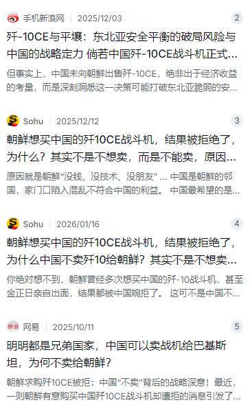 朝鲜想买中国的歼10CE战斗机,结果被拒绝了,为什么中国不卖歼10给朝鲜?其实不是不想卖,而是不能卖,原因就是朝鲜“没钱、没技术、没朋友”。 麻烦看官老爷们右上角点击一下“关注”,方便您进行讨论和分享,感谢您的支持! 歼-10CE作为咱们最先进的外贸机型,性能上已经超越了“四代机”的范畴,达到了“四代半”的水平,航电、雷达和武器系统都是世界一流的。把它卖给朝鲜,那可真是被各种“硬钉子”给卡死了,归纳起来就是大家常说的“没钱、没技术、没朋友”,其实还得加上一个“没条件”。这几条加起来,就成了怎么都绕不过去的坎。 歼-10CE是歼-10C的出口型号,长16.9米,高5.7米,最大时速能到1350公里,作战半径差不多1240公里。它在国际市场上是出了名的抢手货,巴基斯坦拿着它打下了战绩,埃及一口气买了40架。不过,想把它带回家可不便宜,一架裸机价格就在4000万到7000万美元之间,要是配上弹药、零件和全套培训,最后算下来单架成本轻轻松松就奔着1亿美元去了。 这个天价,对朝鲜来说,简直就是天文数字。朝鲜这几年的军费预算,满打满算也就在40多亿美元上下浮动,2025年公布的数字大概是41.8亿美元。这点钱,得先养活那上百万拿着枪的现役部队,还得优先保障核武器和导弹研发的投入。空军分到的那一份本来就少,如果硬要凑钱买一个中队的歼-10CE,恐怕得花掉好几年的军费预算,这完全超出了他们的经济承受力。 其实,对歼-10CE这种级别的“高精尖”来说,价格昂贵还不是最大的难题。它最难的地方在于,这玩意儿是一整套现代化的作战系统。它靠的是有源相控阵雷达,走的是高速数据链,平时维护必须用专业的设备和高水平的技师。可朝鲜空军的情况呢?目前它的家底还很薄弱,总共有1600多架飞机,其中绝大多数都是歼-5、米格-19这些苏联时代的古董,连最先进的米格-29也没多少。雷达网络有盲区,指挥系统跟不上,油料保障也经常短缺。飞行员每年的训练时间也远远落后于世界主流水平。在这样的底子上,把歼-10CE开过去,很可能就成了一堆飞不起来、修不动的昂贵铁疙瘩。 再说国际法规这个绕不过去的红线。自从2006年朝鲜进行第一次核试验后,联合国安理会就通过了第1718号决议,明确要求所有成员国不能向朝鲜卖武器,包括坦克、战斗机这些重型装备。中国作为安理会常任理事国,一向是国际规则的坚定维护者,商务部也早就发文强调过禁运要求。在这种情况下,如果中国卖了歼-10CE,那等于亲手拆了自己参与制定的规则,不仅外交信誉受损,还可能在复杂的国际博弈里让自己陷入被动。 在地缘政治上,这事儿就更是牵一发而动全身了。朝鲜半岛的局势一直是微妙的平衡,韩国空军装备了F-15K、F-16,连F-35隐形战机都有了,日本也在不断扩充军备。要是把歼-10CE卖给朝鲜,美韩同盟必然强力反弹,可能会在韩国增派F-22,甚至部署更先进的进攻性武器。这等于是在火药桶上点了一根火柴,很可能触发东北亚新一轮的军备竞赛。中国一直希望半岛和平稳定,肯定不会做这种火上浇油的事。 其实朝鲜自己也很清楚这事儿有多难。据说他们早在2015年就曾尝试向俄罗斯买苏-35,但同样因为制裁问题没谈拢。这两年又把精力转向了研发大型驱逐舰、导弹和无人机,走的是不对称威慑的路子。最近又有消息说他们可能转向采购俄罗斯的苏-34战斗轰炸机,但具体结果如何,还得看未来的发展。 中国婉拒朝鲜购买歼-10CE的请求,是基于经济实力、技术鸿沟、国际法规和地区安全等多个方面的综合考虑。这背后反映的不仅是一笔军事交易,更是一个国家在复杂的国际环境中,对自身实力和外部规则权衡之后的无奈。