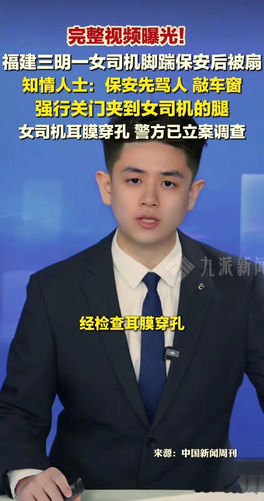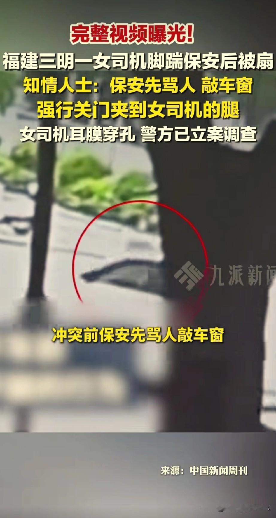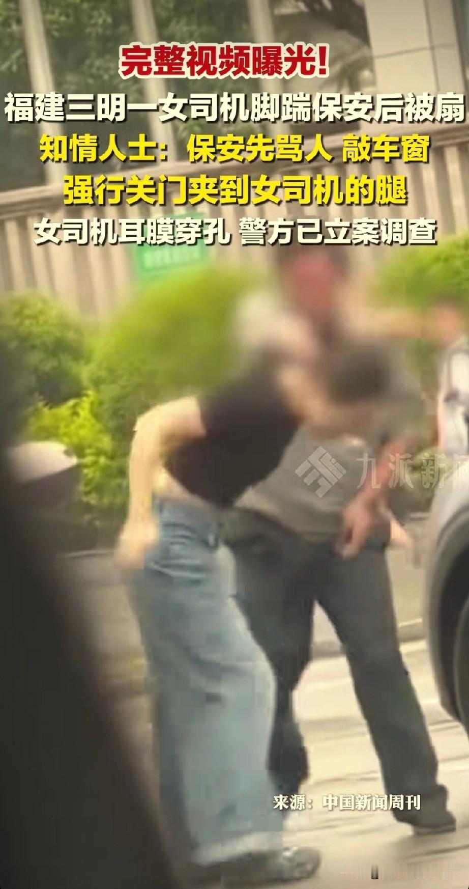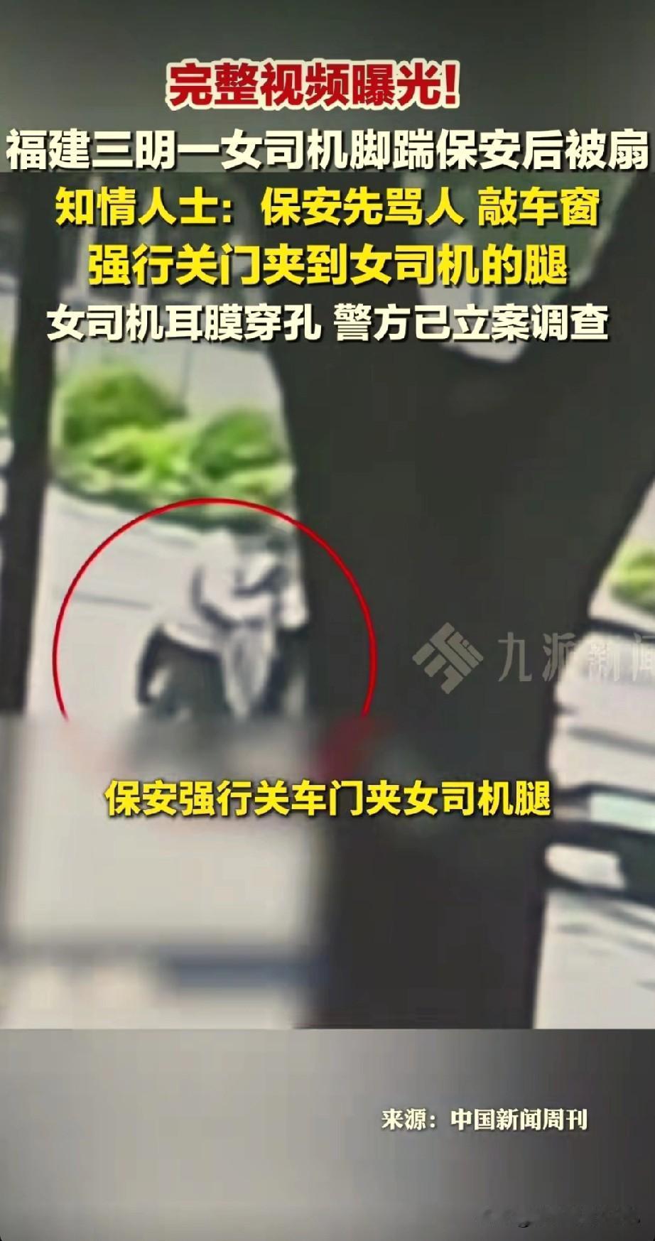真相来了!福建女司机脚踹保安被扇耳光的完整视频曝光,保安戾气太重了,女司机被打得耳膜穿孔! 据知情人士透露,冲突发生在学校门口,女司机是去接孩子放学的,因为保安不让她在那里停车引发冲突! 冲突前是保安先骂人敲车窗,并且在女司机要下车时,保安强行关车门夹女司机的腿,这才导致女司机下车后情绪失控,踹了保安一脚! 从视频上看,女司机这一脚明显的只是为了发泄一下不满,并没有用力。但是保安反手给她的一耳光,却是卯足了力气,啪的一声十分的响亮! 咱就是说,有什么事情不能好好说啊!一个学校门口的保安,都能这么牛吗? 之前网上流传的视频掐头去尾,只有女司机用脚踹保安,保安反手打她巴掌的过程,却没有前面争执的过程。导致很多网友认为是女司机在无理取闹,还在为保安的勇敢反击叫好! 现在完整视频公布出来了,才知道是这个保安做的太过分了! 冲动是魔鬼,保安的这一记响亮的耳光,直接导致女司机的耳膜穿孔。女司机报警后,警方已经立案,等待这个保安的将是法律的制裁! (信息来源: 九派新闻)