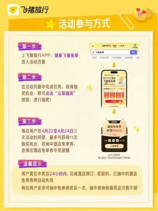 飞猪免单 飞猪这次直接搞五一酒店免单,活动就三天从4月22号到24号,身边真有人中奖了,赶紧拉着闺蜜一起去试试,希望能省一笔住宿费,五一安心出去玩
