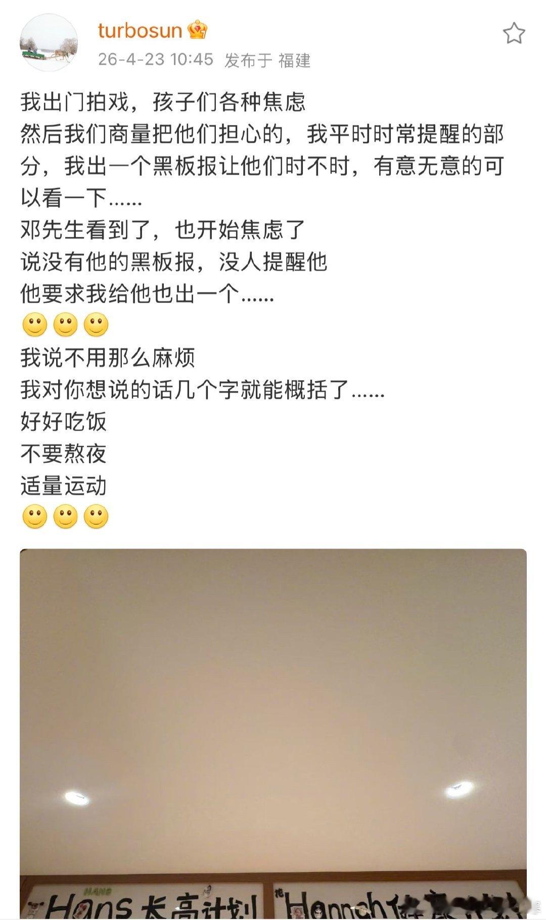 邓超要求孙俪也给他出个黑板报孙俪给等等小花出的黑板报邓超看到孙俪给等等小花出的黑板报,直接开启“争宠”模式,说没有自己的专属提醒就没人管他哈哈哈