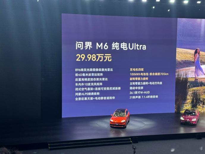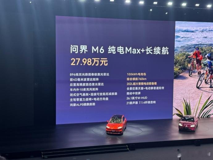 问界 M6:中大型五座纯电 SUV,轴距2950mm,主打华为 ADS 4.1、鸿蒙座舱、896 线激光雷达、空悬。