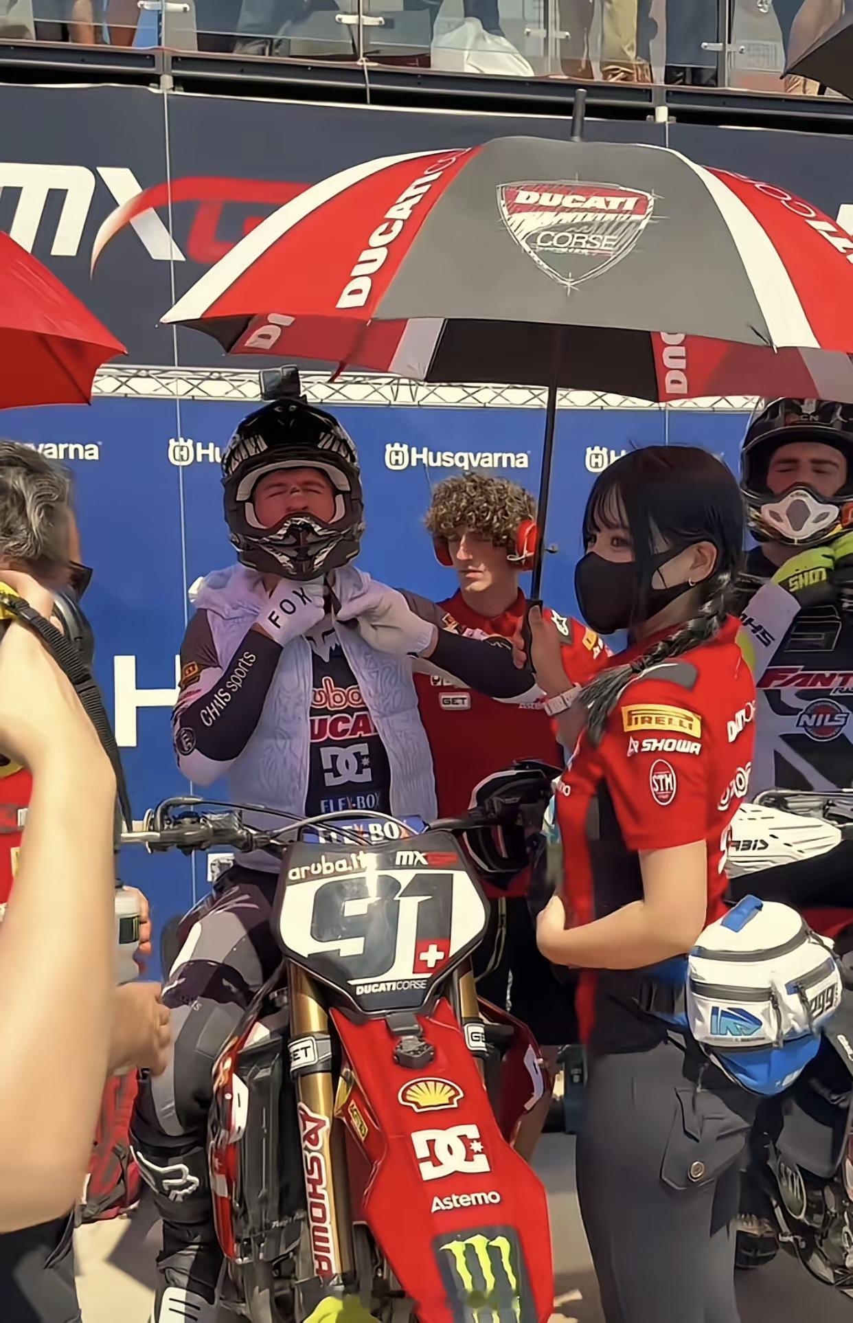 难怪法国车手去到哪里都吹他的老板:张雪!别的车手都是美女撑伞,这位是个“油腻大叔”撑伞?