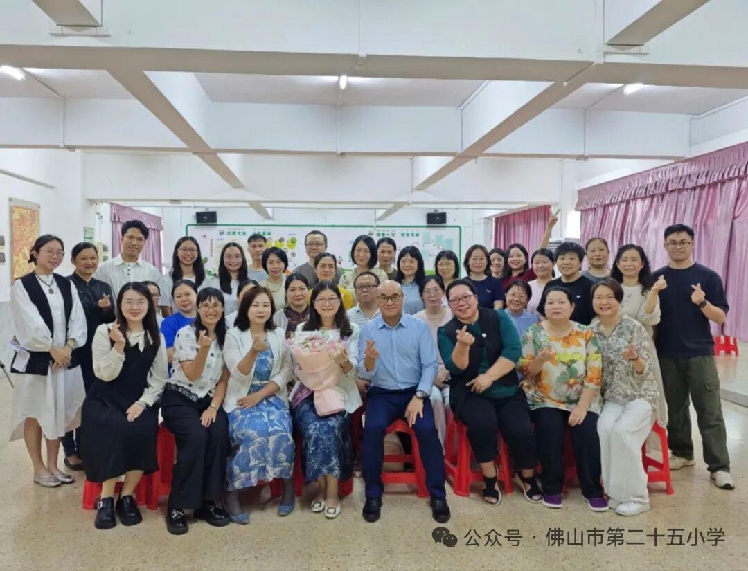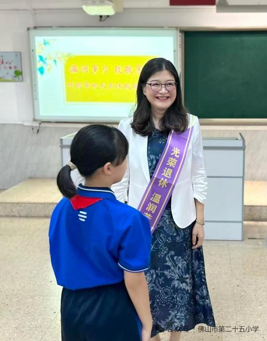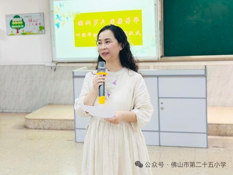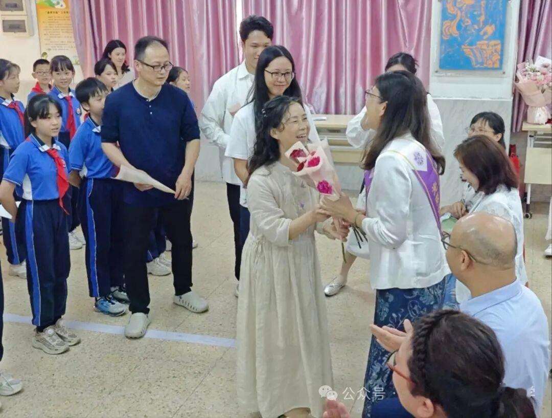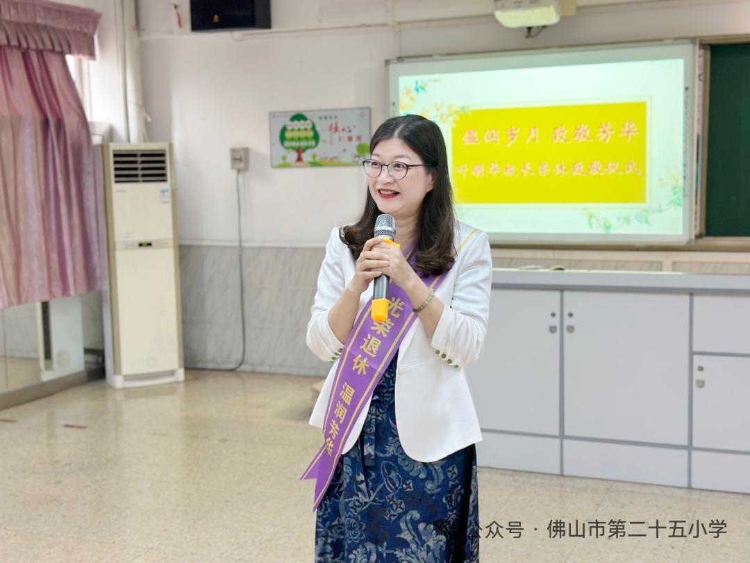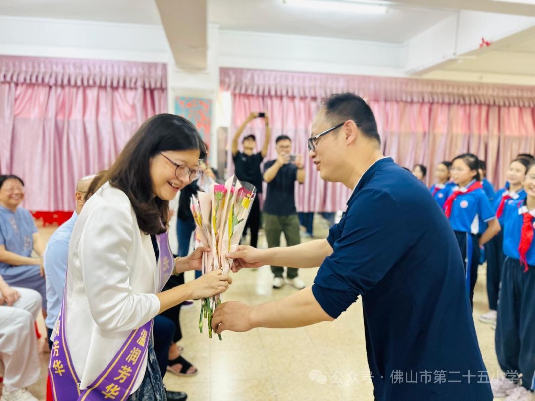 佛山二十五小叶明华校长荣休致敬仪式 3月31日举行,全体教职工欢迎叶明华校长到场, 学生代表为叶校长佩戴绶带,教师代表蔡凯萍老师追忆与叶校长的共事时光,邝碧霞校长送上最诚意的敬意和祝福,叶校长发表荣休感言。