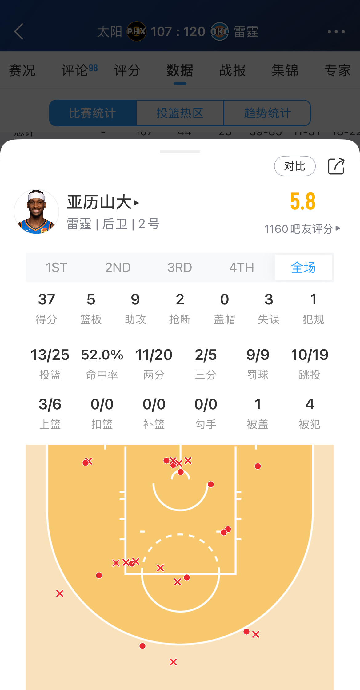 亚历山大全场砍下37分5板9助,52%命中率太阳vs雷霆