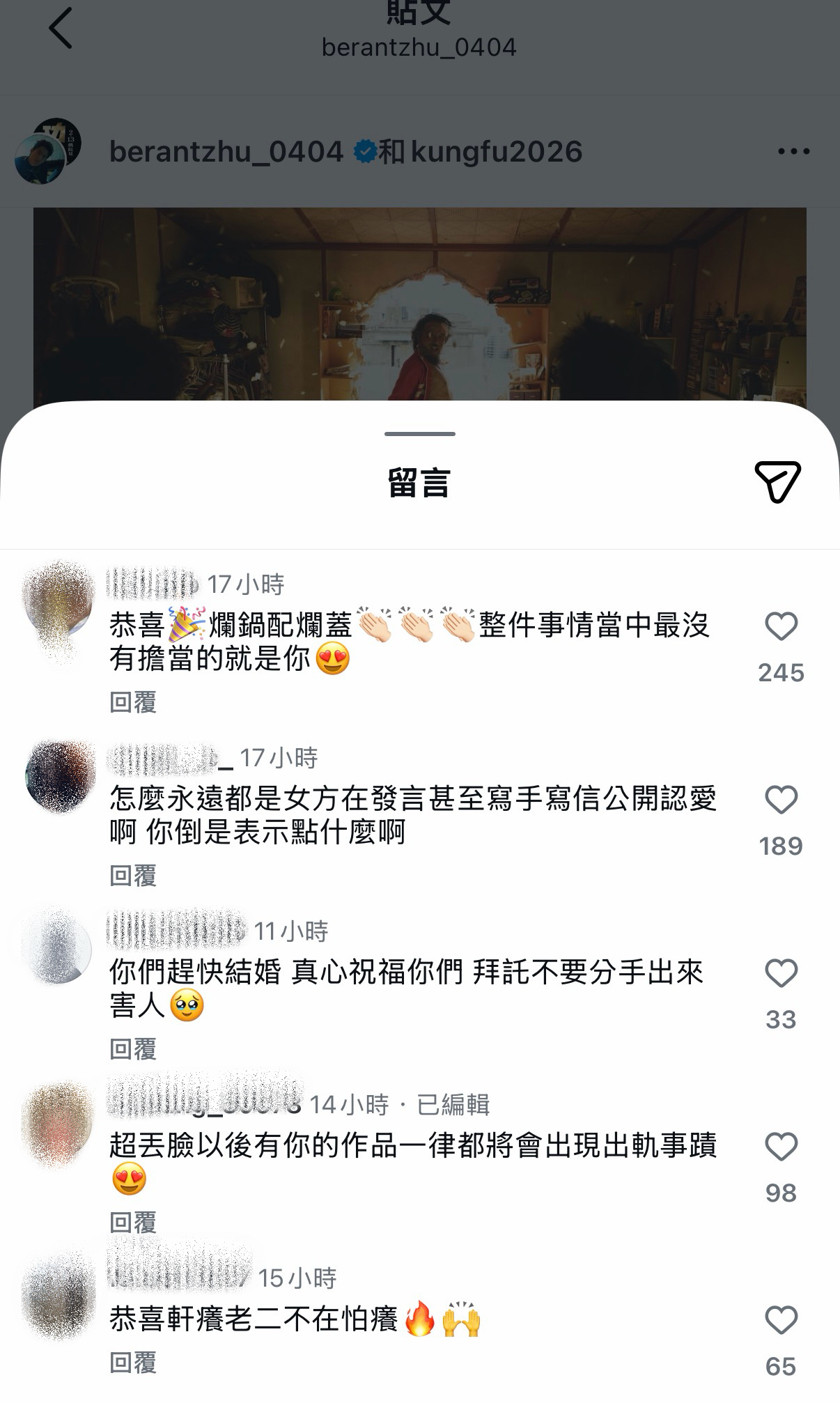 「你们赶快结婚 真心祝福你们 拜托不要分手出来害人🥺」「超丢脸以后有你的作品一律都将会出现出轨事迹😍」…