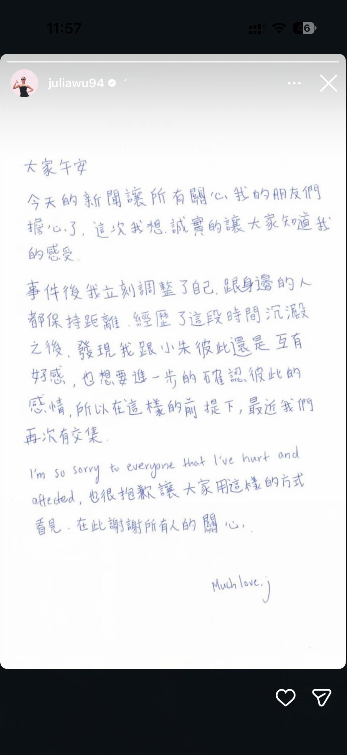 昨天在公司先回应后,吴卓源也在限动贴出认爱手写信