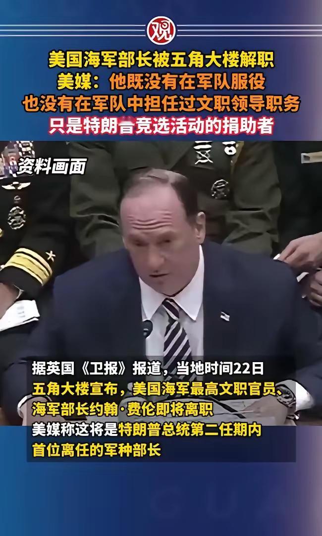 又一部长被拿下,特朗普是过河拆桥呢?还是大义灭亲? 当地时间2026年4月22日,美国海军部长约翰·费伦被五角大楼突然解职。此人既无军队服役经历,也无军方文职领导经验,核心身份是特朗普竞选的大额捐助者,靠政治献金上位,上任之初就饱受争议。 此次解雇并非偶然。费伦与国防部长长期不和,多次越级对接白宫,同时在舰艇建造、军费预算等关键问题上与五角大楼路线冲突。正值美伊海上局势紧张,军方高层认为其履职不力、难以统筹海军事务。 这只是特朗普第二任期人事大清洗的最新一例。特朗普第二任期上台15个月,已公开解职至少22名内阁部长、四星将军、情报执法一把手;加上被边缘化、劝退、买断的,遭清洗的中高层官员达数百人,是现代美国史上最激进的人事“大换血”。