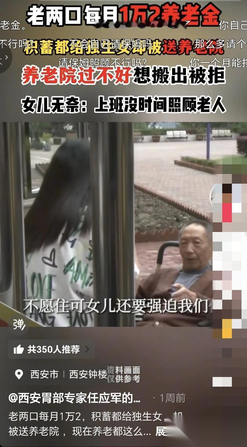重庆一对老两口,将自己每月1.2万元的养老金和一辈子的积蓄全部交给独生女保管,本以为能换来安稳的居家照料,万万没有料到,底牌交得干干净净,转头就被送进了民办养老院。 老父亲在镜头前哭着求回家的画面,刺痛了不少人。网上的骂声铺天盖地,都在戳这闺女的脊梁骨,说她图财忘恩。 可你要是掀开这出伦理悲剧的帘子,就会发现,这底下全是底层人算不清的糊涂账。 先看看这个挨骂的女儿过的是什么日子。 快五十岁的人,还得熬大夜干三班倒的客服。丈夫在外头打着零工,一家五口人,硬生生挤在七十来平的老破小里,连个转身的地方都勉强。 面对得了阿尔茨海默症的母亲和重病的父亲,稍微算算现实这笔账,就知道路根本走不通。 在市面上找个差不多点的住家护工,起步就得六千往上走。可她累死累活干满一个月,工资单上也就五千出头。 硬接回家养着? 她要是辞职在家伺候,家里直接断粮,一家老小跟着挨饿;要是接着去上班,两鬓斑白的爹妈在家出点什么意外,连个打120的人都没有。 把爹妈送进有专人看着的机构,哪是什么丧尽天良。不过是一个兜里没钱的中年人,被生活逼到死角后剩下的唯一活路。 这几年国内一直提倡“9073”的养老大格局。意思是九成的老人在家靠社区养老。 这思路确实好,但这套模式想要顺畅落地,得有大前提:要么家里底子厚,雇得起人;要么儿女有闲工夫,能时常陪在床前。 两样都不占?居家养老就是个不切实际的幻梦。 重庆老两口这出事,算是给大伙儿重重提了个醒。 不少长辈总觉得,趁早把身家全盘托出,能换来儿女在床前的一片孝心。这绝对是晚年最糊涂的一笔账。 老人自以为提前掏空钱包是体谅年轻人,其实是亲手砸掉了自己挡风遮雨的最后一道墙。 真到了病床前,面对每天花钱如流水的账单和压死人的生活大山,亲情往往扛不住几下折腾。 与其拿晚年的安稳去考验儿女的能力和良心,不如把退休金和房本牢牢抓在自己手心里。 底牌攥住,那才叫底气。过度托付,输掉的往往是晚年最后的尊严。 对此,你怎么看?