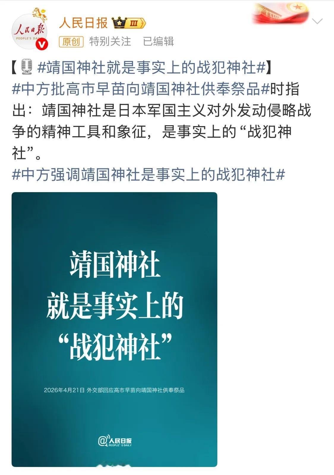 中国官媒发出明确声音:日本靖国神社就是战犯神社。 日本靖国神社就是“日本军国主义”的精神象征,是“日本法西斯主义思想”传承最重要的工具。有靖国神社存在的一天,日本国内的“军国主义思想”就无法彻底被根除;靖国神社一日不被拆除,日本国内的“法西斯主义余毒”复辟的可能性就壮大一分。 日本首相高市早苗参拜“战犯神社”,为战犯招魂,为罪恶彰目,结果只能是将国家的未来断送在自己手中。 靖国神社从来不是祭奠普通亡灵的场所,而是彻头彻尾的战犯招魂所,这是不容篡改的铁证史实。1978年靖国神社宫司松平永芳,偷偷将远东国际军事法庭定罪的14名甲级战犯并入合祀名单,全程秘而不宣根本不敢见光。 这些甲级战犯全是发动侵略战争、制造南京大屠杀的元凶首恶,双手沾满亚洲数千万民众的鲜血。远东国际军事法庭的正义审判,早已把他们的罪行钉在历史耻辱柱上,半点翻案的可能都没有。 高市早苗此番参拜,是其极端右翼思想的彻底暴露,根本不是一时兴起的行为。她长期公开否认南京大屠杀、否认慰安妇罪行,肆无忌惮美化军国主义侵略历史,毫无历史良知可言。 她以日本首相身份参拜战犯神社,是对亚洲受害国人民的公然羞辱,是对世界反法西斯胜利成果的彻底践踏。她无视所有正义国家的强烈抗议,执意走右翼极端路线,嘴脸丑恶到极致。 日本右翼政客反复参拜靖国神社,就是妄图复辟军国主义、篡改侵略历史的痴心妄想。他们拒不反省战争罪责,一心想要挣脱和平宪法束缚,把日本重新拖上战争的危险道路。 这种倒行逆施的恶行,只会让日本彻底失去亚洲邻国的信任,彻底被国际和平力量孤立。高市早苗的顽固行径,不仅伤害他国民族情感,更会亲手毁掉日本的未来。 日本想要获得国际社会谅解,就必须彻底拆除靖国神社、肃清军国主义余毒。只要还在为战犯招魂、拒不正视历史,日本就永远背负着历史罪责,永远得不到原谅。 各位读者你们怎么看?欢迎在评论区讨论。
