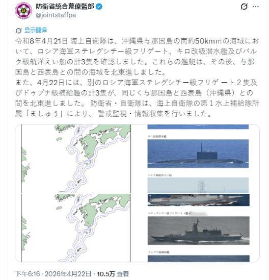 就在所有人都以为俄日关系暂时平稳的时候,普京突然出手,给了日本一个措手不及,堪称近期最重磅的突发消息。日本防卫省统合幕僚监部紧急证实,2026年4月21日,日本海上自卫队在琉球与那国岛以南约50公里处,发现了三艘俄罗斯海军舰艇,分别是一艘“守护”级护卫舰、一艘“基洛”级潜艇和一艘“布克”级远洋拖船,随后这些舰艇直接向东北方向驶去,穿过与那国岛和西表岛之间的海域,全程态度强硬,没有丝毫避让,可把日本急坏了。 可能有人不知道,这可不是俄罗斯第一次对日本释放强硬信号,而且这次的举动,背后藏着深层原因。一直以来,俄日之间就有南千岛群岛(日本称北方四岛)的领土争端,普京曾明确表示,这些岛屿是俄罗斯的主权领土,是二战结果确定的,不容重新审视,这些年俄罗斯还在岛上部署了导弹系统,就是为了警告日本不要轻举妄动。 除此之外,前段时间日本还参与了美军在俄远东边境附近的大规模军演,俄方当时就提出了强烈抗议,称这种行为对俄罗斯安全构成威胁,会引发相应反制。 更值得注意的是,日本这些年一直在推进“再军事化”,不仅将军费增加到GDP的2%,还大规模采购进攻性武器,放宽军事装备出口,一步步架空和平宪法,这让俄罗斯十分警惕。 而且日本一直抱美国的大腿,跟着美国对俄实施“制裁”,甚至计划修改外交和安全政策,加强与美国的同盟合作,试图借助美国的力量,在领土争端上向俄罗斯施压。这次俄罗斯舰艇逼近琉球海域,就是对日本这些行为的直接反制,也是在宣示自己的军事存在。 我个人觉得,普京这次的举动,不是故意挑起冲突,更多是为了维护俄罗斯的自身利益,也是对日本的警告。俄罗斯一直以来都很强硬,只要其他国家触及自己的底线,就会果断反击,日本不断挑衅俄罗斯,自然会遭到反制。 不过这也不代表俄日会彻底走向对抗,毕竟两国还有一定的经贸合作,只是在领土和安全问题上,双方分歧很大。其实不管是俄罗斯还是日本,都应该保持理性,通过对话解决分歧,一味的强硬和挑衅,只会让局势变得更紧张,最终受伤的还是两国的普通民众。