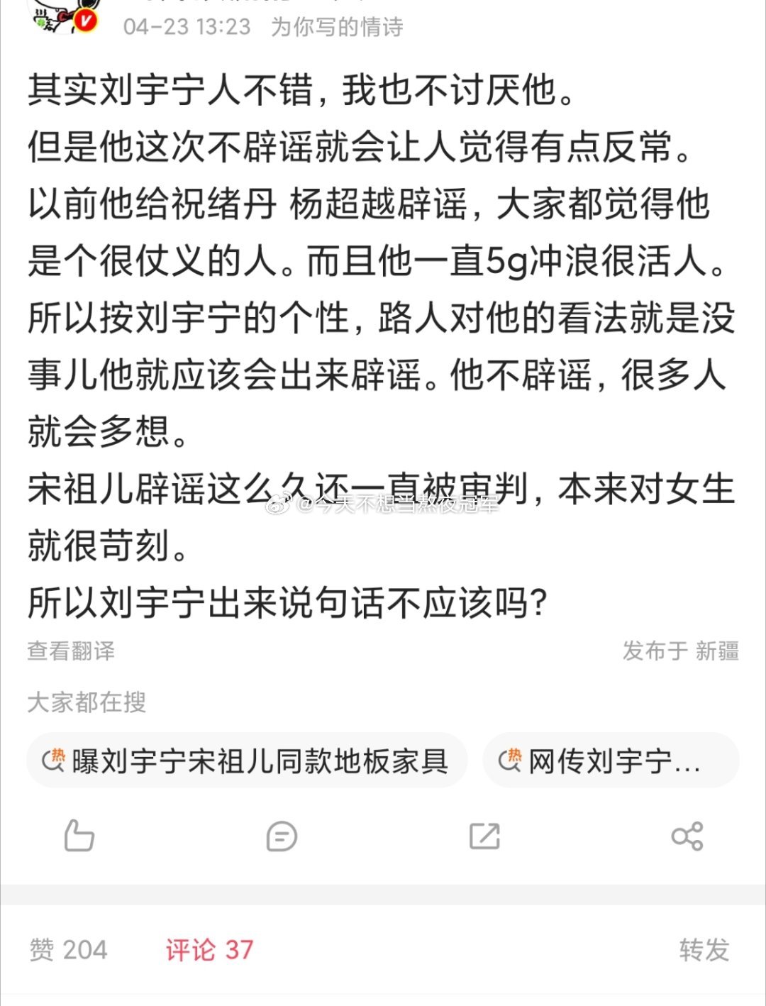 刘宇宁之前跟合作的女演员杨超越、祝绪丹也传过恋情🍉,但顶刘马上就回应了。有网友觉得5g冲浪的活人这次不打假,显得很反常而且单方面让宋祖儿承受大审判很没担当。 y1s1,你们觉得这次顶刘该站出来说话吗?宋祖儿 刘宇宁