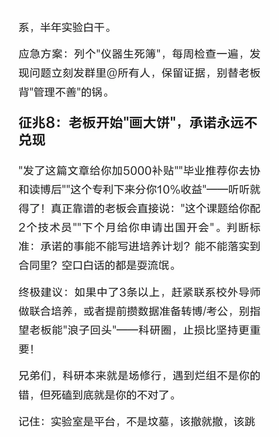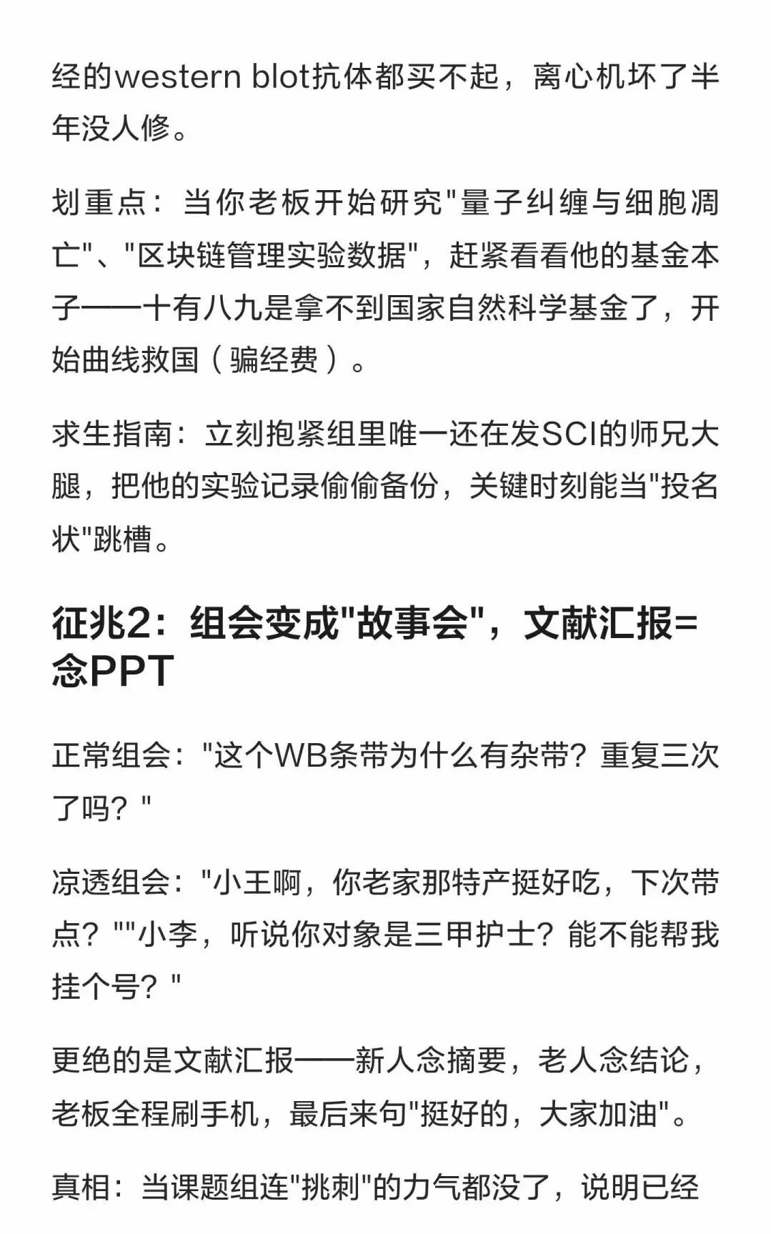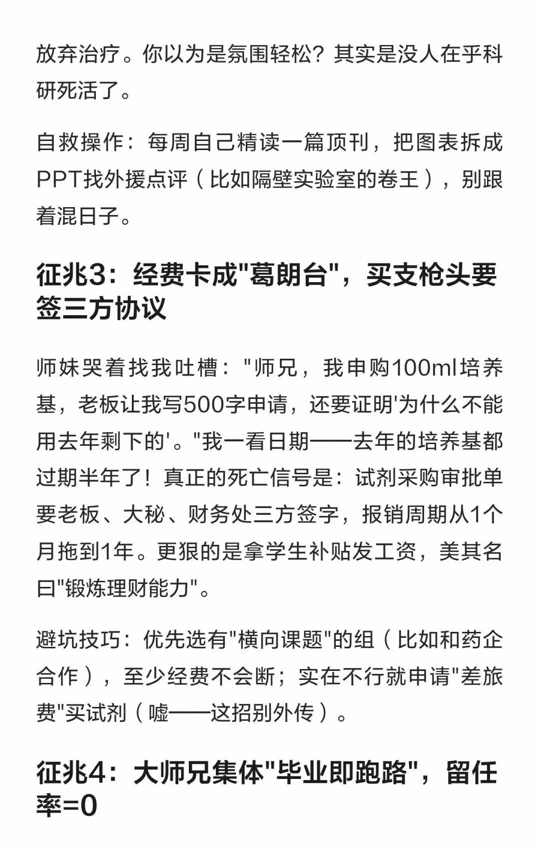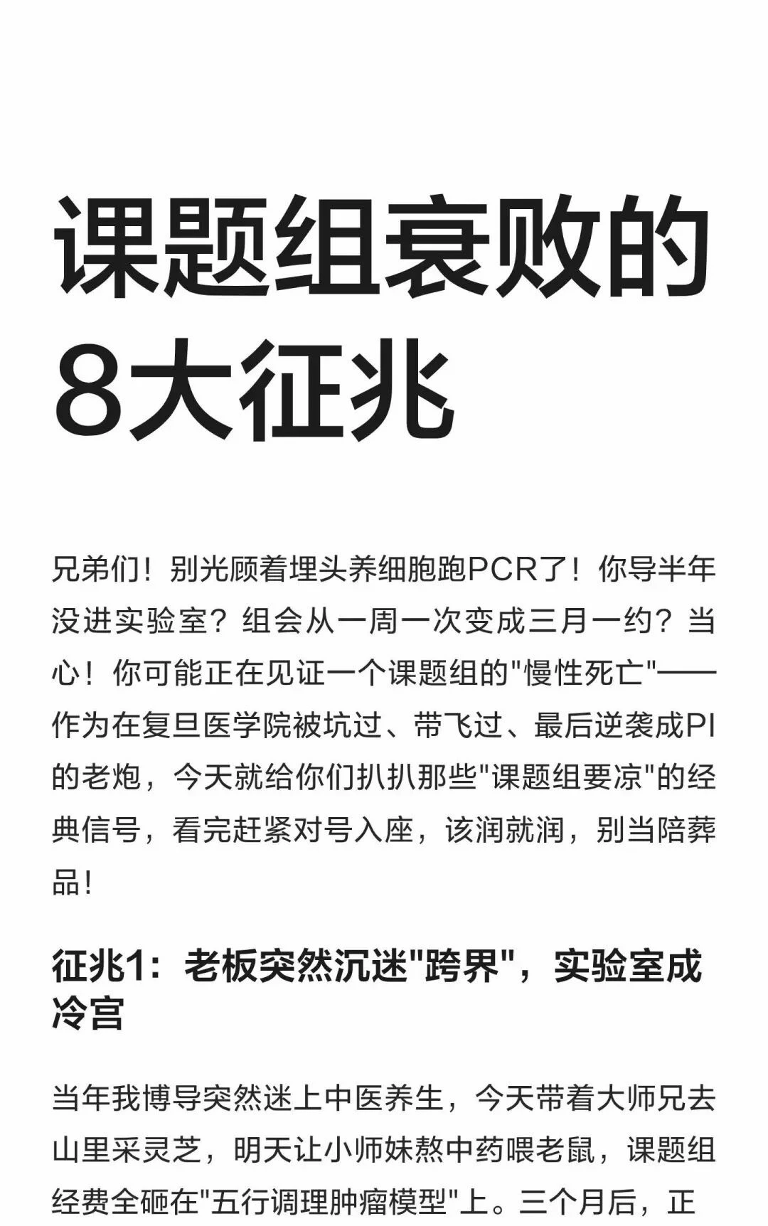 兄弟们!别光顾着埋头养细胞跑PCR了!你导半年没进实验室?组会从一周一次变成三月一约?当心!你可能正在见证一个课题组的"慢性死亡作为在复旦医学院被坑过、带飞过、最后逆袭成PI的老炮,今天就给你们扒扒那些"课题组要凉"的经典信号,看完赶紧对号入座,该润就润,别当陪葬品! 征兆1:老板突然沉迷"跨界",实验室成 冷宫 当年我博导突然迷
