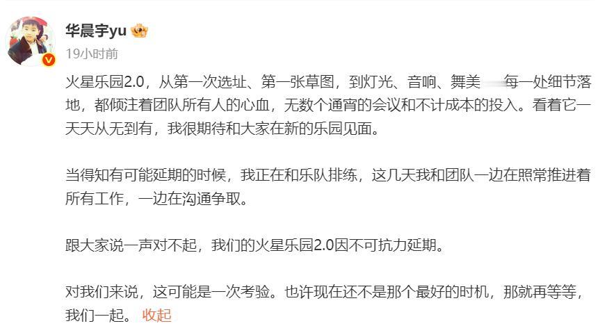 【当地文旅局回应华晨宇演唱会延期:延期原因以官方通告为准】华晨宇演唱会延期当地酒店价格回落 4月22日晚,歌手华晨宇发文致歉,在云南举办的火星乐园2.0因不可抗力延期。随后,他开直播时没忍住哭了。当晚,火星演唱会官方发文公布退票方案。4月23日,记者致电澄江市文旅局,工作人员表示延期原因以官方公告为准。 在此之前,华晨宇官宣五一演唱会在抚仙湖举行后,周边民宿、酒店价格疯涨引发争议。 华晨宇官宣五一演唱会计划后,当地酒店、民宿涨价就开始引发争议。记者注意到,早在二十多天以前,就有网友反映酒店涨价离谱,吐槽几乎持续了快一个月。 4月30日,有网友发文吐槽,位于抚仙湖广龙小镇的一家喆啡酒店,平时价格为200元左右,4月30日晚开始,价格涨到2508元,涨价十倍以上。 4月10日,有网友在网上吐槽:“订的酒店相同的房型,相邻的两天,一间97元,一间857元。” 4月21日,有网友发帖称,“五一”期间云南玉溪抚仙湖景区将举行华晨宇演唱会,附近两家酒店分别推出了379元和381元普通帐篷,网友纷纷吐槽“价格离谱”。有网友计算,一套普通露营帐篷售价仅几百元,酒店推出的单人帐篷每晚381元,性价比过低。 记者注意到,两家酒店的“帐篷房”目前均已经下架。 “我昨晚一晚上都睡不好,3点多才睡着,整个人都不好。”长沙市民张女士是华晨宇粉丝,4月22日晚,歌手华晨宇发文称演唱会因不可抗力延期并公布退票方案后,她表示心情受到极大影响。不过对于粉丝而言,尽快退掉已经订好的酒店是更为理智的选择。 已经有粉丝退订成功。网友“gi”表示写明真实退订原因后,民宿老板免费秒退。 4月23日,记者在平台上搜索抚仙湖周边酒店,价格均较为正常。此前被网友吐槽价格涨到2508元的喆啡酒店广龙小镇店,5月1日晚的价格已经降到1207元。 4月2日,澄江市旅游行业协会、民宿协会联合市文旅局、市工信局发布《关于发布澄江市2026年重大节假日、重大活动期间住宿业客房诚信指导价的通告》,其中最高指导价为“以上一年度同期市场价格为基础,涨幅不超过50%”,适用时限为重大法定节假日及重大活动期间。 4月23日,澄江市文化和旅游局工作人员告诉记者,华晨宇演唱会延期原因以官方通告为准,后续会发布公告。记者询问是否是因为酒店涨价或五一客流压力,工作人员表示不是。(潇湘晨报·晨视频)