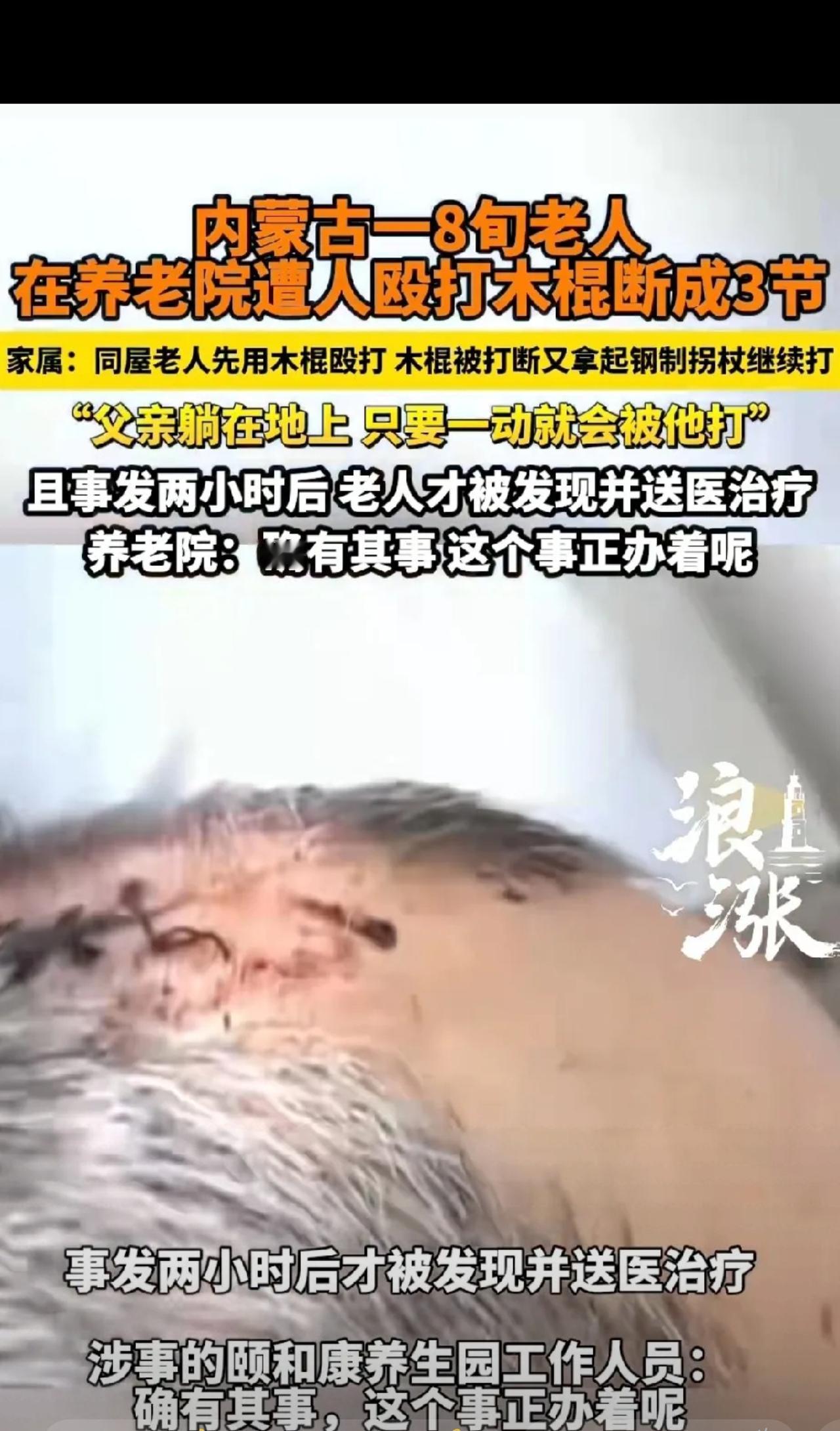 内蒙古赤峰,老伴要给眼睛做手术,儿女们又太忙,没法贴身照顾,不得已将80岁老人送到养老院。谁知,没过几天,就遭到同住的老头殴打,老头将木棍打断成3截,还不解气,又拿起钢制拐杖继续打,只要老人一动就会挨打。老人被打得嘴角流血,全身青紫。直到两个多小时后,才被发现送到了医院。对此,家属心疼又气愤,但养老院却淡定表示∶确有其事,这个事正办着呢! 真的越看越窒息!内蒙古赤峰一桩养老悲剧,看完彻底颠覆对养老院的认知,80岁无辜老人,不过是临时托管几天,竟在养老院里遭遇非人的殴打,全程无人过问,养老院的态度,更是让全网网友怒到破防!😭 这位八旬大爷,晚年日子本就过得不容易,自身体弱多病,日常起居都离不开人照顾,老伴儿自身也难保,腿脚重度残疾,却依旧拼尽全力照顾他,老两口相依为命,哪怕日子清贫,也从没让老人受过一点伤、遭过一点罪。 可命运偏偏不肯放过这对苦命老人,前不久,老伴儿的眼睛突然急病发作,确诊急性泪囊炎,病情十分凶险,医生再三叮嘱,必须立刻去外地大医院做手术,一旦拖延,直接面临失明的结局。 一边是自己的眼睛急需手术,一边是无人照料的老伴,家里的儿女个个被生活压得喘不过气,上班、养家连轴转,根本抽不出完整时间全天陪护,实在是走投无路、万般无奈,才咬着牙把老人送到附近养老院,只求能临时照看几天。 老两口满心信任地把老人托付出去,家属也反复跟养老院叮嘱,老人年纪大、身子弱,麻烦多上心。老伴儿术前天天跟老人视频,看着老人状态平稳,才敢安心进手术室。 术后她眼睛缠满纱布,连睁眼都做不到,彻底和老人断了联系,心里天天七上八下,就怕老人有半点闪失。可没等她康复,养老院的一通反常电话,直接让家属的心沉到谷底。 电话里,养老院工作人员吞吞吐吐,全程不提老人状况,只一个劲催促家属赶紧来接人,丝毫没有透露老人已经遭遇意外的实情。 家属察觉大事不妙,老伴儿不顾术后伤口疼痛,执意出院,和儿女火速赶往养老院,结果眼前的一幕,让所有人当场破防! 原本精神尚可的老人,变得萎靡不振,嘴角带着干涸的血迹,胳膊、后背、身上遍布大块淤青,浑身伤痕累累,连动弹都显得十分吃力,完全是被折磨后的模样。 在家属的反复质问下,养老院再也瞒不下去,才道出了令人发指的真相:同屋居住的老人,莫名对大爷大打出手,先是手持木棍疯狂殴打,直接把木棍打断成三截,施暴者依旧不肯停手,转而拿起钢制拐杖,狠狠砸向老人! 年迈的老人毫无反抗之力,被打得瘫倒在地,只要稍微挪动,就会迎来新一轮殴打,就这样,这场残忍的施暴持续了整整2小时!而这期间,养老院没有任何护工巡房,没有任何人制止、救助,任由老人承受暴力! 事发后,家属悲痛又愤怒,找养老院讨要说法,没想到养老院全程淡定冷漠,没有丝毫愧疚,只轻描淡写一句“这事我们正在办”,就想草草了事! 网友彻底怒了,评论区骂声一片! 🔥“这养老院就是摆设吗?2小时都没人发现,收服务费的时候怎么不这么敷衍?” 🔥“80岁老人怎么下得去手?施暴者毫无人性,养老院更是失职到极致!” 🔥“年轻人谁愿意送老人去养老院?都是被逼无奈,结果信任错付,太让人心寒了” 🔥“别拿‘正在办’糊弄人,监管缺位、看护失职,必须严惩养老院,给老人一个交代!” 我的心里话,越说越气愤 做内容这么久,看过不少养老糟心事,但这一件,真的让我久久不能平静。 当下社会,年轻人养老难是现实,要赚钱养家、要兼顾生活,实在没办法时刻陪在老人身边,才会把养老机构当成最后的依靠,这份托付,是沉甸甸的信任,更是老人的生命安全。 可偏偏有些养老机构,只看重利益,完全丢掉了责任和良心,连最基本的定时巡查、安全防护都做不到,对入住老人的安危不管不顾,任由暴力事件发生,这不是养老,是把老人推向险境! 从法律层面来讲,养老院作为专业照护机构,对入住老人有着不可推卸的安全保障义务,老人在院内被殴打两小时无人管,属于严重的管理失职,按照《民法典》规定,施暴者承担主要侵权责任,养老院必须承担相应的补充赔偿责任,相关责任人也该被严肃追责! 养老无小事,老人的安全容不得半点马虎,一句轻飘飘的“正在办”,弥补不了老人的伤痛,也平息不了大众的怒火! 真心希望相关部门能严查到底,严惩施暴者和失职养老院,也给所有养老机构敲响警钟:既然做了养老行业,就要扛起责任,善待每一位老人! 也想问问大家,面对养老难题,你更倾向于居家照顾还是选养老院?你觉得这件事养老院该负全责吗?