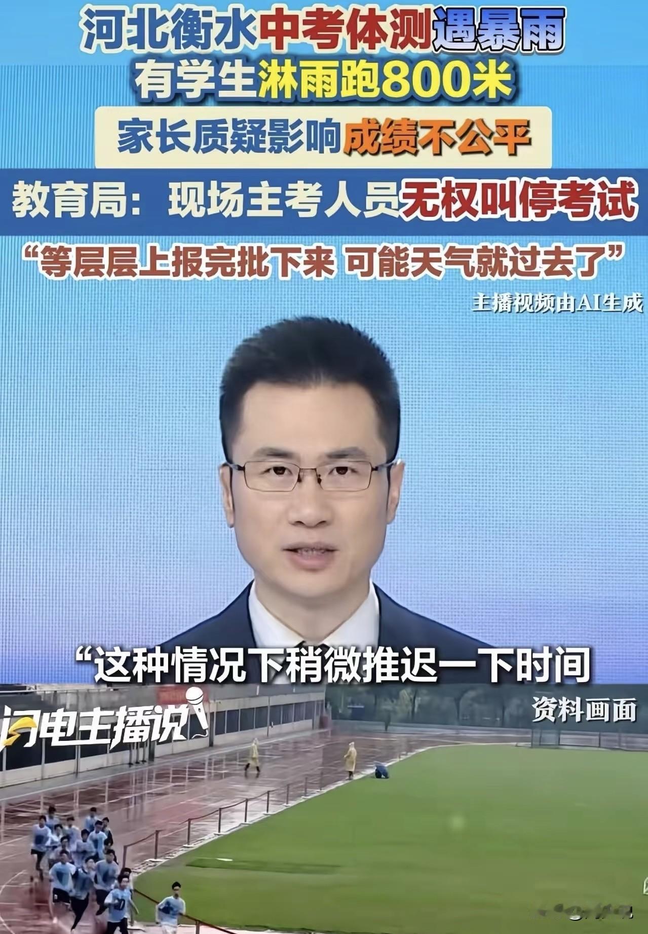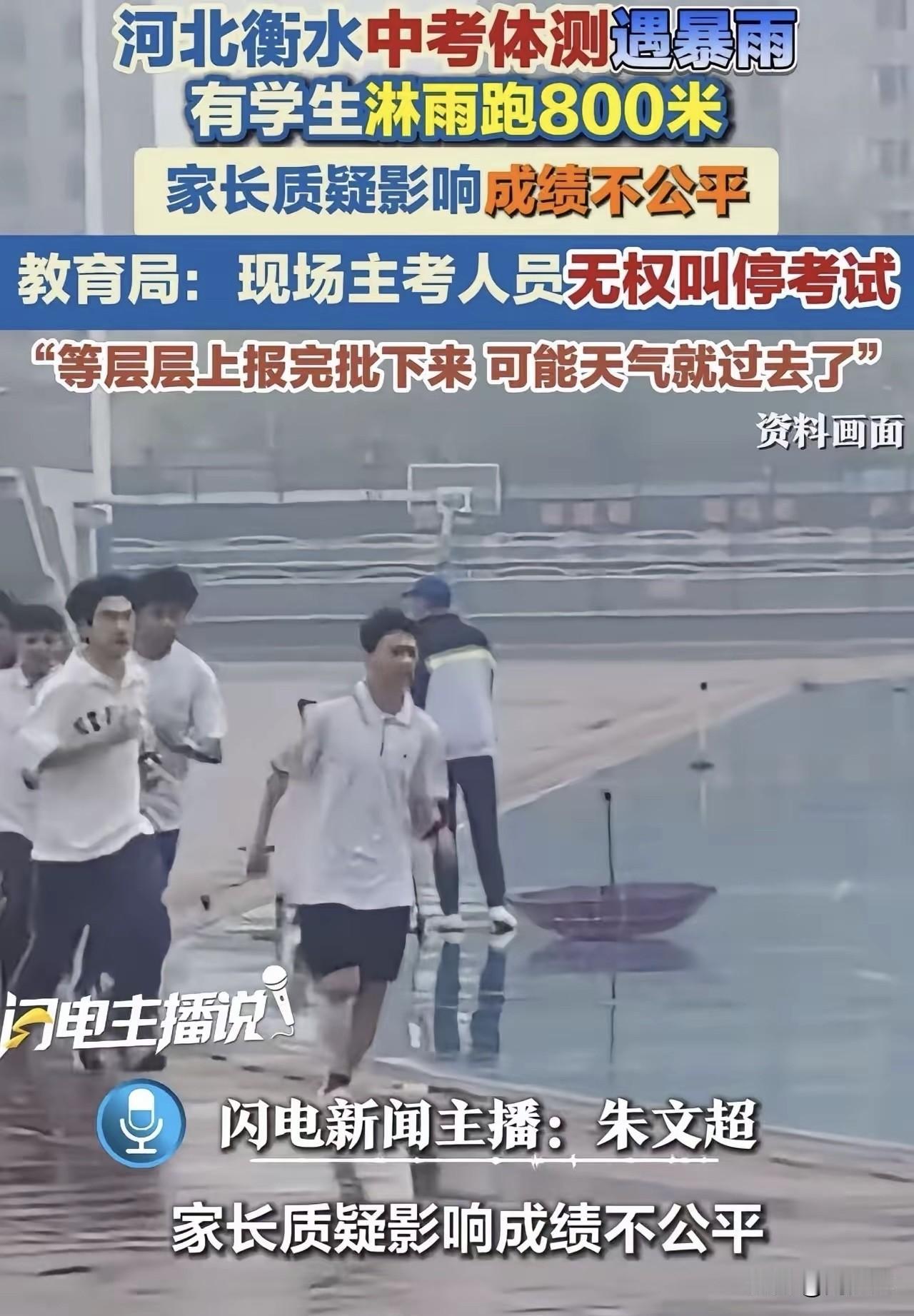 “看着都揪心!”谁能想到,一场本该公平公正的中考体育测试,竟被一场突如其来的暴雨,搅得全网吵翻了….. 据媒体报道,2026年4月19日,河北衡水桃城区中考体测现场,倾盆大雨毫无征兆落下,跑道瞬间积满雨水,不少学生顶着暴雨跑完800米,浑身湿透的模样,让无数家长心疼不已。 暴雨砸在脸上,学生们连睁眼都费劲,脚步踩在积水里踉踉跄跄,不仅跑步节奏被打乱,体力也消耗得更快。 不少孩子冲过终点后,冻得浑身发抖,头发和衣服滴着水,看着格外让人心疼。家长们把现场画面发到网上,立刻引发了轩然大波,大家的质疑声接连不断。 有网友直言:“中考体育分分必争,晴天考试和暴雨考试,状态天差地别,这对淋雨的孩子来说,实在谈不上公平。” 也有家长担忧:“淋雨跑完很容易感冒,要是影响后续文化课考试,孩子这么久的努力不就白费了?” 面对家长们的不满,当地教育局的回应透着诸多无奈:体测日程是提前统筹安排的,牵扯到太多环节,没法随意改动;现场监考人员并没有临时叫停考试的权限,调整考试需要层层上报审批,往往流程还没走完,暴雨就已经过去了。 其实站在教育公平的角度来看,周少觉得这件事着实值得深思。中考作为重要的升学考试,公平性本就是核心底线,天气这类不可抗因素,本该是考试筹备中提前预判的问题。虽说教育局的回应合规矩,却少了几分对学生的人性化考量。 考试规则固然要遵守,但也不妨多一些灵活调整的空间,毕竟比起死守流程,孩子的身体健康和考试的公平性,才是更该放在首位的。 当然,这事更给我们提醒,后续考试的应急方案,真的该好好优化,多站在学生的角度考虑,才能让升学考试真正做到温暖又公平。#周少说教育# #寻美三湘# #寻美湖南#
