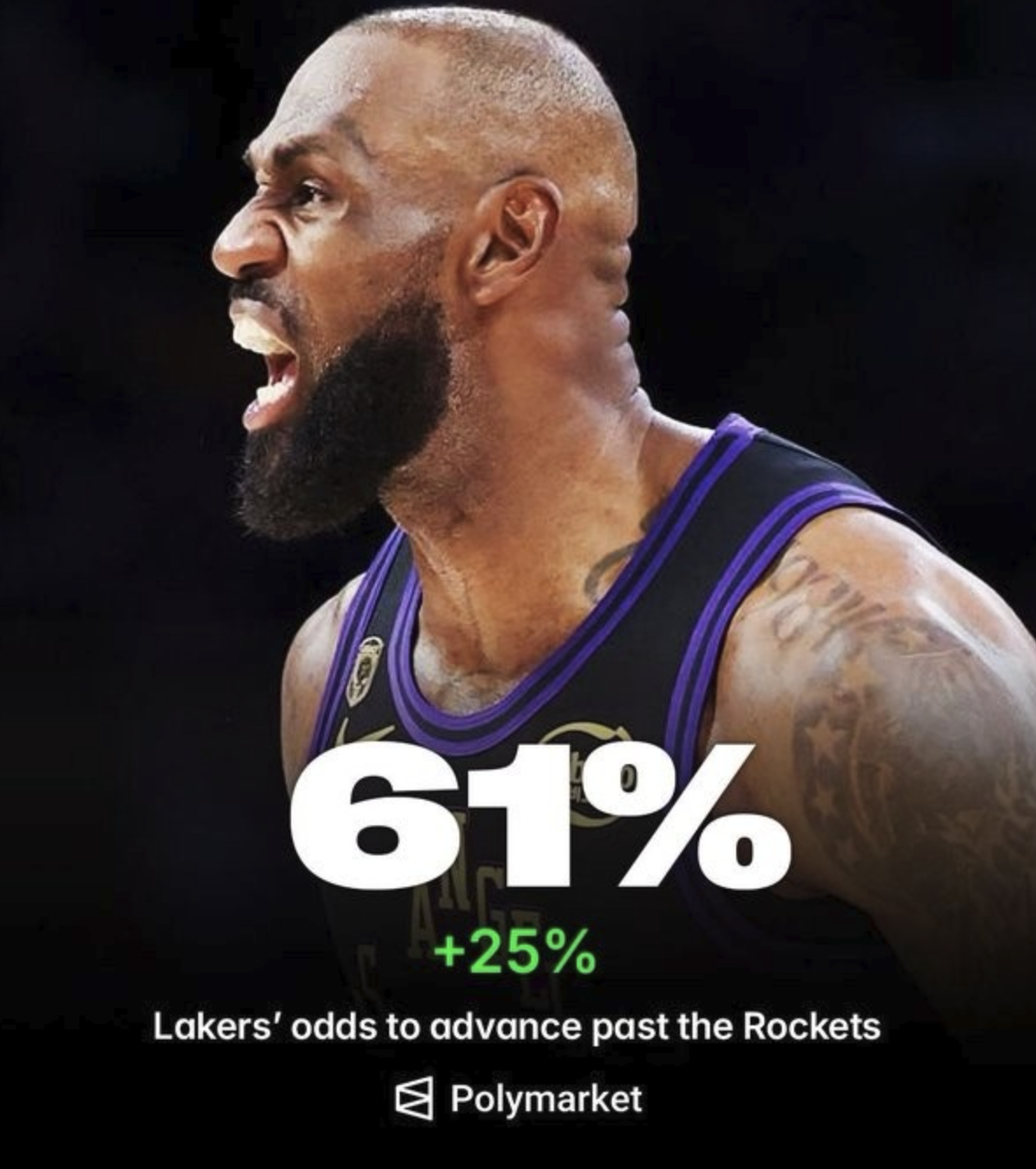 随着湖人2-0领先火箭,他们的晋级概率由此前的25%暴涨至61%。