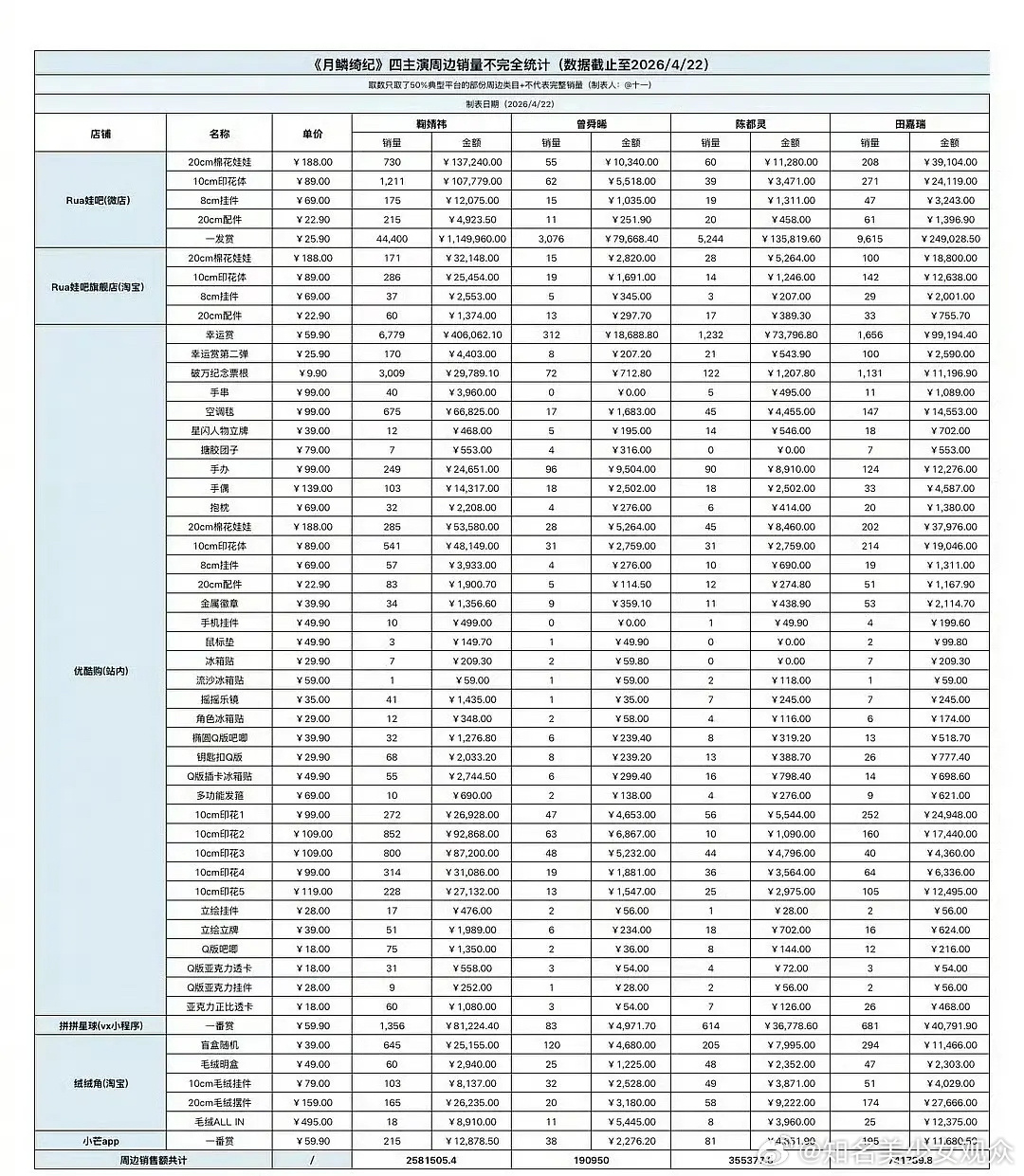 网传鞠婧祎、曾舜晞、陈都灵、田嘉瑞《月鳞绮纪》周边销量统计,但好像有些不太对吧