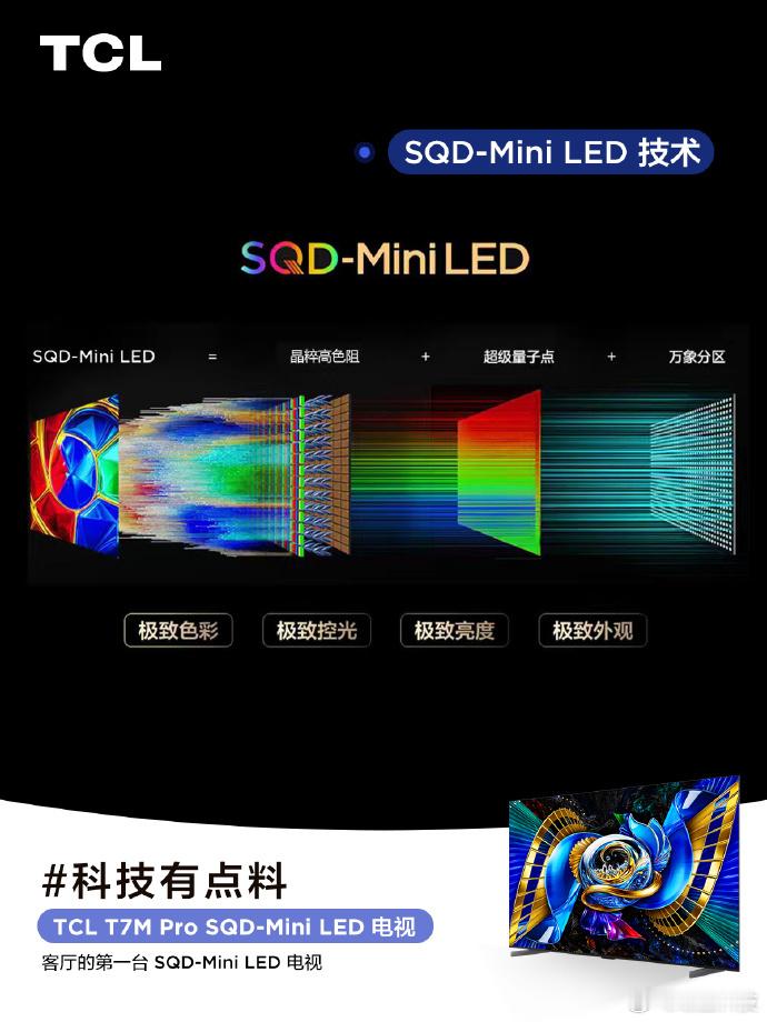高端技术下放到主流消费旗舰是种什么体验?说的就是搭载了SQD-MiniLED技术的TCL T7M Pro啦 看过我们测评的小伙伴估计都知道TCL的SQD-MiniLED技术对画质的提升有多大,像高画质必备的三板斧:高对比度、高亮度和高色域统统都给你准备上;