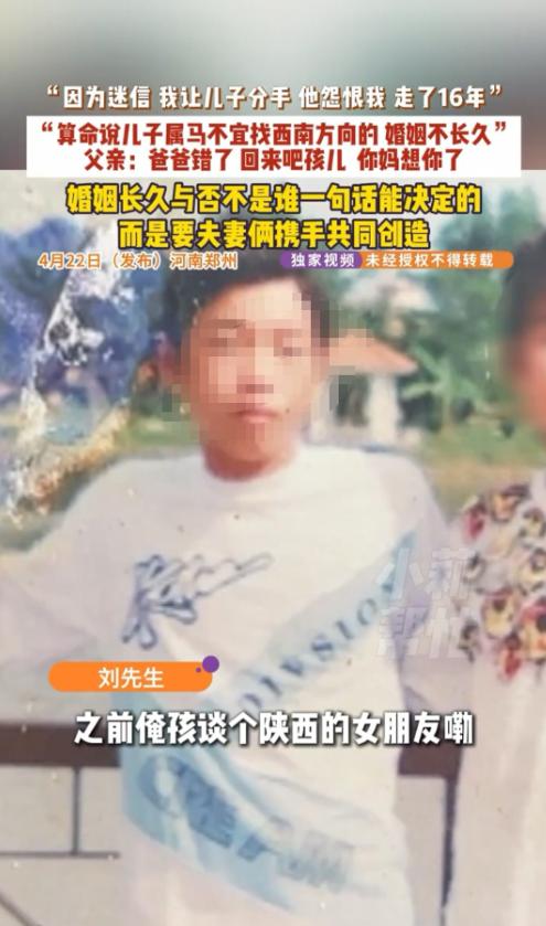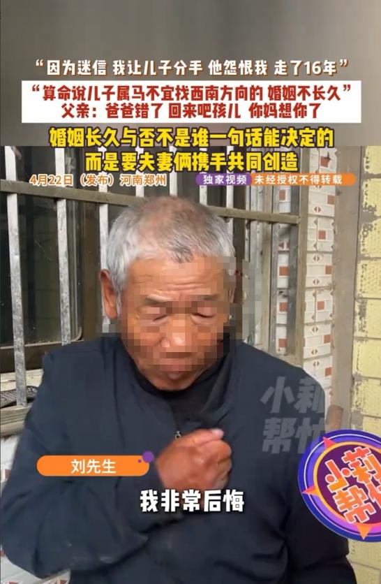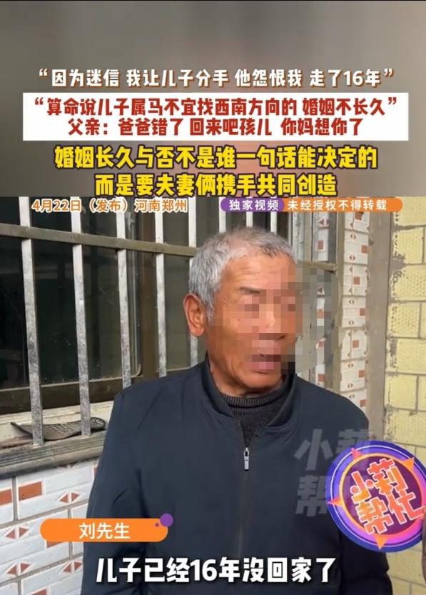 真是让人唏嘘又无奈!河南郑州有个小伙子叫小刘,这辈子谈了三次恋爱,可每一次,都被他亲爹给搅黄了,没一段能走到最后。 一气之下,他没跟家里留一句话,直接离家出走了,这一走,就是整整十六年! 这十六年里,他跟家里彻底断了联系,一个电话都没打过,就是故意躲着父母,不想再有任何牵扯。 直到最近,他爸年纪大了,才慢慢回过味来,开始后悔当初的所作所为,到处托亲戚朋友打听儿子的下落,好不容易才得知,儿子以前在上海住过。 他又急又喜,来不及多想,匆匆收拾了东西就往上海赶,满心都是愧疚,就想见到儿子,跟他道个歉、求个原谅。 可谁知道,等他赶到儿子以前住的地方,房东的一句话,直接让他从头凉到脚:你儿子早就搬走了,走之前特意跟我说,不让家里人找他,他这辈子,都不会原谅你们。 这事发生在河南郑州,主角是小刘和他的父亲刘先生。小刘到了谈婚论嫁的年纪,他爸比谁都急,天天催着儿子找对象、成家,就盼着能早点抱上孙辈,也算完成自己的一桩心愿。 老辈人常说“儿孙自有儿孙福,莫为儿孙做马牛”,道理谁都懂,可真正能做到放手的父母,却没几个。 刘先生就是这样,嘴上盼着儿子幸福,行动上却把儿子的人生牢牢攥在手里,连谈恋爱都要按自己的标准来,这样的“爱”,真的能让儿子幸福吗? 小刘其实挺省心,没让父母托媒人,自己就谈了个陕西的姑娘,两人感情很稳定,还特意带回家让父母把关,满心欢喜地以为能得到父母的认可。 可谁知道,刚进门,他爸就劈头盖脸地让他分手,说陕西离河南太远,来回奔波花销大,家里根本负担不起,还一口咬定女方父母不会同意女儿远嫁,两人迟早走不到最后。 小刘心里不服气,感情哪能用钱来衡量,可架不住父亲反复劝说,加上这段感情还不深,最终还是妥协了,草草结束了第一段恋情。 有了第一次的教训,小刘第二次谈恋爱特意找了个离家近的姑娘,就想避开远嫁的矛盾,不让父母再阻拦。 可他把人带回家,刘先生还是看不上,觉得女方各方面条件都配不上自己的儿子,甚至直白地说,基因很重要,自己的孙辈必须聪慧可爱,不能被孩子的母亲影响样貌和资质,小刘心里委屈,可还是习惯性地顺从了父亲,又一次分手了。 直到第三段恋情,彻底压垮了小刘,这个姑娘是平顶山人,离家不远,人长得漂亮、性子又聪慧,深得老两口的心意,两人安稳交往了一年多,婚事也提上了日程,一切都朝着圆满的方向发展。 可没想到,刘先生夫妇非要按当地习俗,找人选了日子,说小刘不宜找西南方向的女子,而这个姑娘,恰好就是这个方位。 刘先生执意要拆散他们,还以老两口的身体作威胁,说不能违背算命的话,耽误儿子一生。 小刘这次坚决不答应,可一边是逼自己的父母,一边是真心相爱的女友,他不想让女友受委屈,只能忍痛放手。 三次感情都被父亲强行拆散,小刘彻底看清了父亲的掌控欲,他知道,只要留在这个家,自己永远没有自主选择的权利,也给不了另一半安稳的未来。 心死之下,他没留只言片语,一气之下就离家出走了,这一走,就是十六年,十六年间,他没给父母打过一次电话,刻意断了所有联系,就是想彻底逃离父亲的控制。 刘先生发现儿子走后,疯了一样四处寻找,可始终没有音讯。十六年来,他和老伴日日守在家里,盼着儿子能回来,可一次次希望都落了空。 直到最近,才有消息说小刘曾在上海居住,刘先生欣喜若狂,连夜收拾行李赶往上海,心里装满了愧疚,准备了一肚子忏悔的话,只求能见到儿子,求得他的原谅。 可到了住处,房东的一句话,让他瞬间跌入谷底:小刘得知他要来,早就搬走了,临走前特意叮嘱,不让家里人找他,他永远不会回来,也永远不会原谅。 无奈之下,刘先生只能找记者,希望借助媒体找到儿子,当面弥补自己的过错。 其实,刘先生的初衷并没有错,天下父母都盼着孩子好,想让孩子少走弯路,可他错就错在,把自己的意愿强加给了儿子,用“为你好”的名义,剥夺了儿子的婚姻自主权。 父母的爱,本该是孩子的避风港,可过度的控制,就变成了束缚孩子的枷锁,就像被拴住的小象,久而久之,要么失去反抗的勇气,要么拼尽全力逃离。 婚姻自由是法律赋予每个人的权利,父母可以给孩子提建议,但不能强迫、不能阻拦,更不能替孩子做人生选择。 所谓的“为你好”,从来不是把自己的想法强加于人,而是尊重孩子的选择,哪怕他会走弯路,也是他成长的必经之路。 十六年的隔阂,不是一句忏悔就能化解的,小刘的决绝,背后是三次被拆散的委屈和多年的压抑。 希望所有父母都能明白,学会放手,才是对孩子最深沉的成全。别让你的“爱”,变成伤害孩子的利器,毕竟,儿孙自有儿孙福,孩子的幸福,从来都不该由父母来定义。 大家对此怎么看?欢迎评论区留下您的观点!