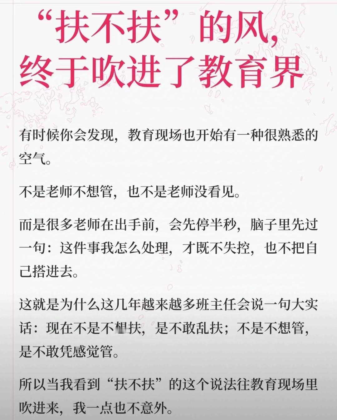 什么样的教育才是对孩子最好的? 社会道德“扶不扶”的顾虑吹进校园,当老师不敢管、不愿管,输掉的到底是老师的体面,还是孩子的成长与未来[what]? 现在老师管教前都要先权衡自保,明明看见问题,却不敢严管、不敢较真。 不是老师责任心消失了,而是一旦管教失度、家校纠纷来临,最先承担代价的永远是一线教师。于是本该及时纠正的坏习惯、该立的规则底线,慢慢变成睁一只眼闭一只眼。 我们总追问怎样的教育才算好?是放任宽松、绝不批评,还是严慈并济、有尺有度?大家觉得,该如何给老师安全感,让教育重拾该有的锋芒与底气?什么样的教育才是对孩子最好的?
