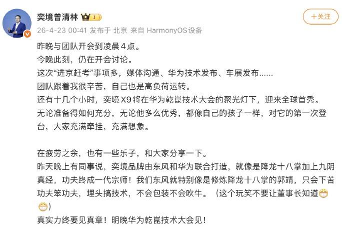 【华系迈巴境来了】4月23日,奕境汽车曾清林公开表示,奕境X9将登陆华为乾崑技术大会,并亮相2026北京车展。此前,奕境首款车型被曝定位大六座旗舰SUV,定名奕境X9。