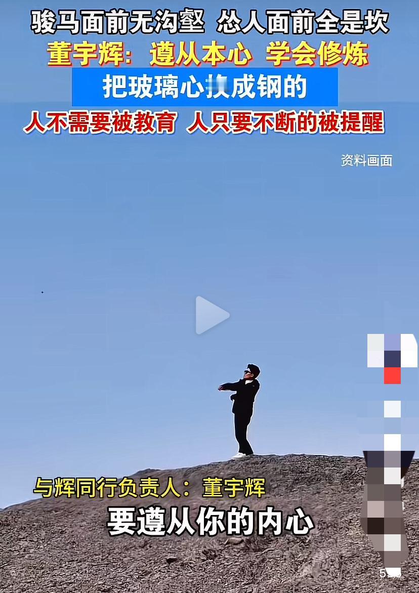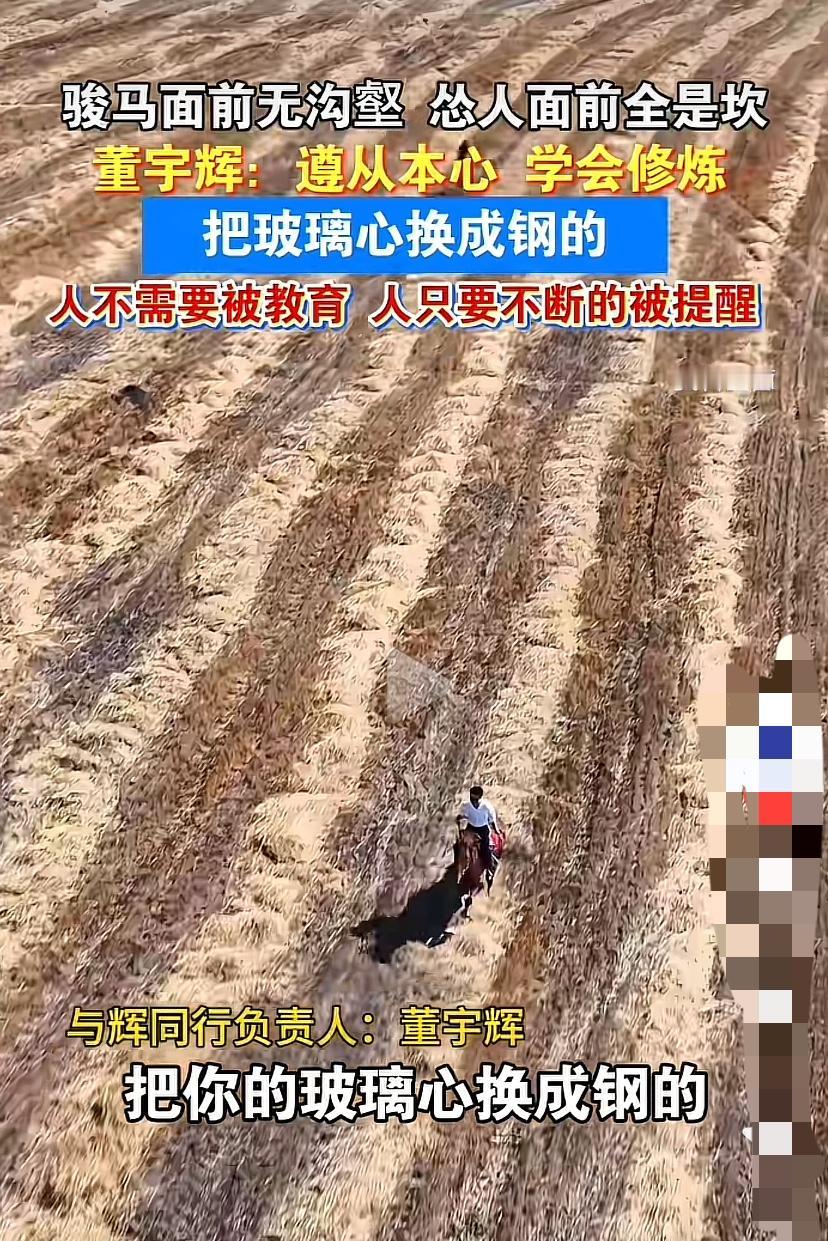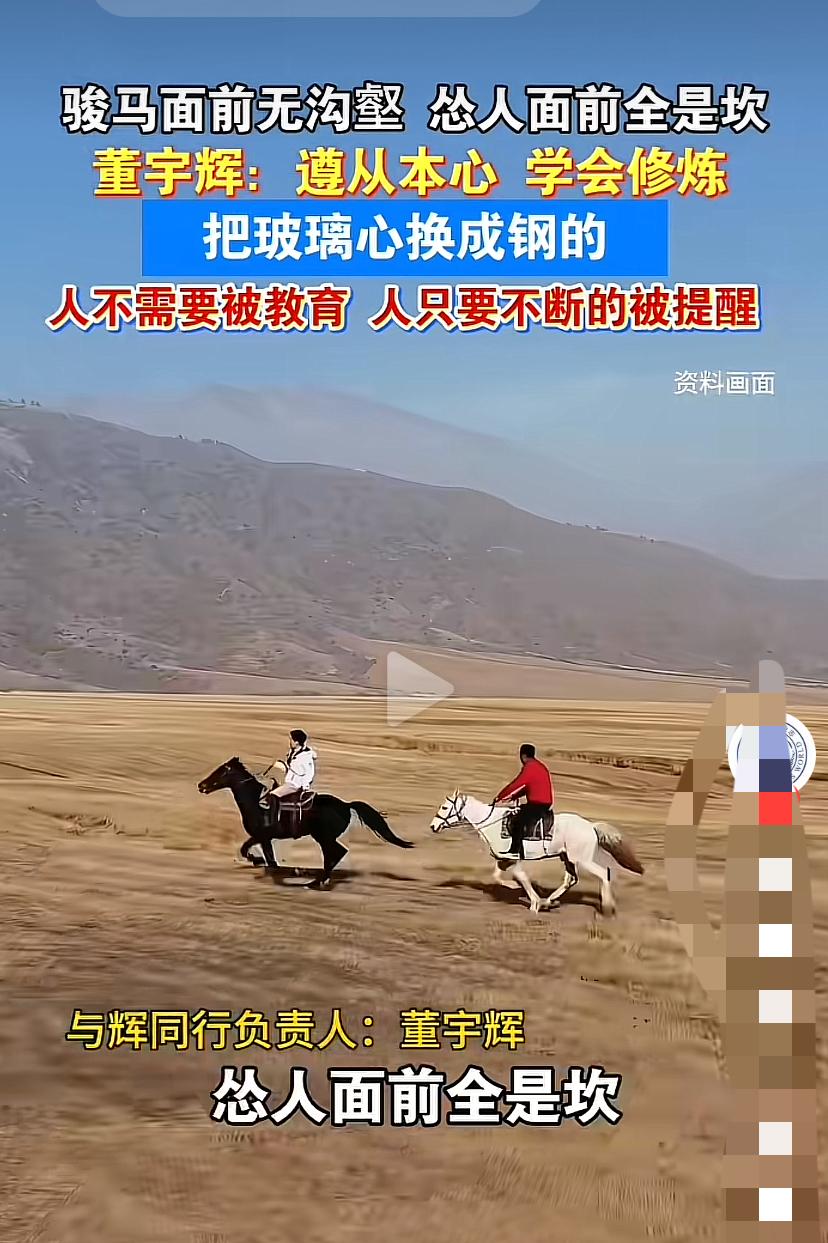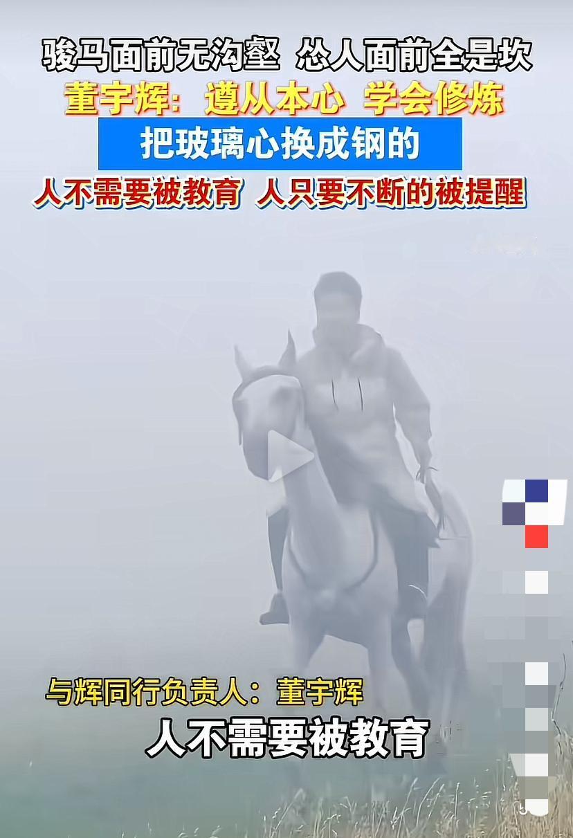 董宇辉正面回击:人无需被教育,更不会认怂 董宇辉策马前行,触景生情,道出了压抑许久的心声。他说:“骏马面前无沟壑,怂人面前全是坎。”人应遵从本心,修炼自我,将玻璃心锤炼成钢铁意志。人不需要被教育,只需不断自我提醒。 董宇辉近期心情不佳,沉默良久后作出回应。从他的话语中能明显看出,他在警示某些人,任凭你们如何抹黑,他绝不认怂,不会玻璃心,反而要让自己更强大,拥有钢铁般的意志,同时警告对方别来教育他。 董宇辉内心足够强大,面对之前的事情波澜不惊,仍能在屏幕前喊出“家人们”,这说明他赢了,他为此感到骄傲。不过,他似乎忘了“马失前蹄,沟壑难过”这句话。