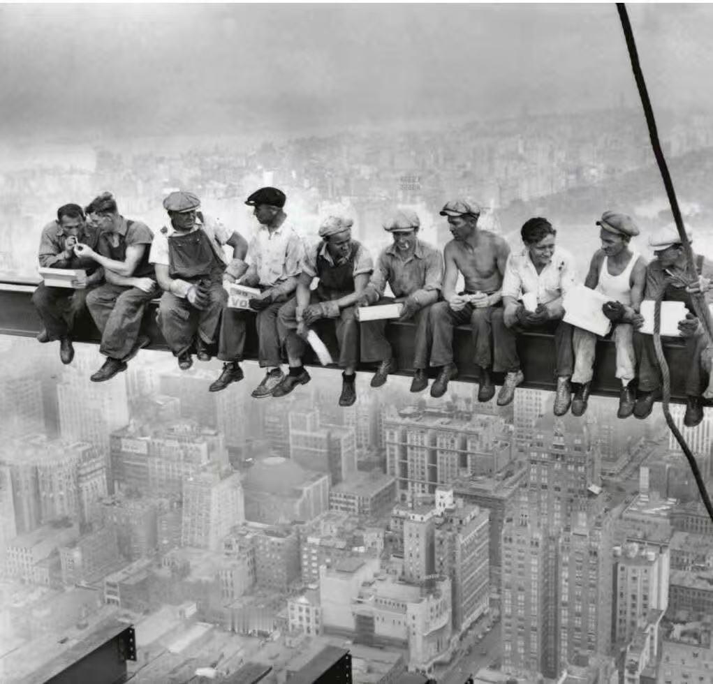 1932年9月底,美国摄影师查尔斯·艾伯茨镜头下高空作业工人们正在就餐!那么高的摩天大楼高耸云端,可见当时美国建筑业已经有多先进了! 该场景拍摄于洛克菲勒中心的最高楼——美国无线电公司大楼,此时工人们正在第69层的钢梁上享用午餐。该摄影作品被取名为《摩天大楼上的午餐》。 此时正值大萧条最为惨淡阶段,工人表情里却看不到任何绝望与悲伤。也正是以这些工人为代表的深入骨髓的自信与从容,让美国社会最终从大萧条的逆境中走出,迎来了新一轮经济大繁荣!老照片