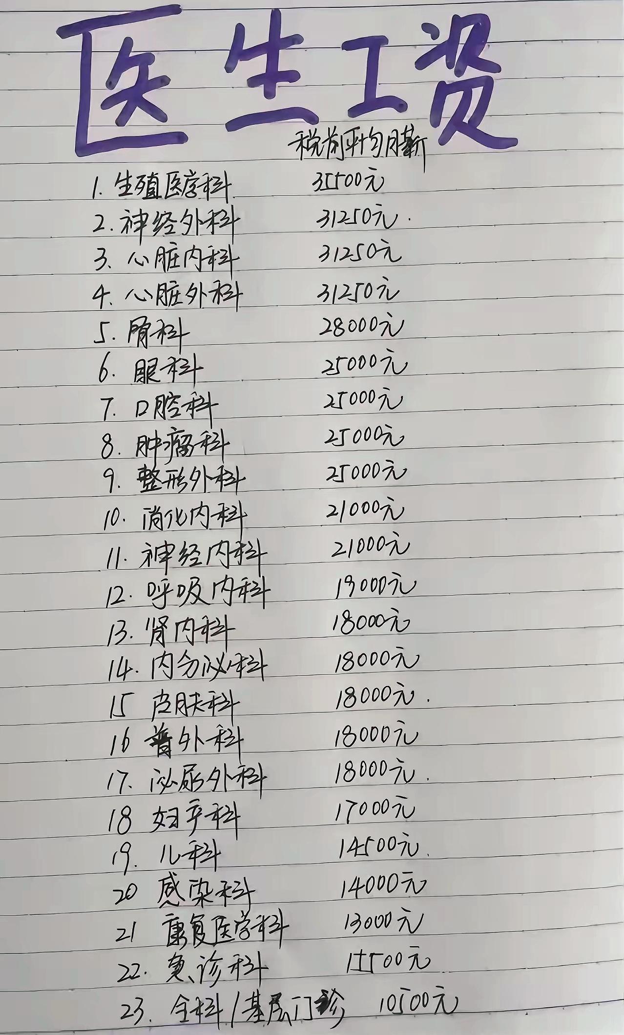 别再只盯着医生的工资数字了! 这份手写的科室收入表,背后是多少个20年寒窗,数不清的夜班、手术和加班熬出来的。 热门科室3万+,冷门科室1万出头,可无论哪个科室,都是拿健康换生活。 手术台一站就是十几个小时,连轴转的夜班,没日没夜的学习和考试, 他们挣的每一分,都是实打实的血汗钱,根本不是“躺着赚钱”。 你们说,医生这份工作,真的值得被误解吗?