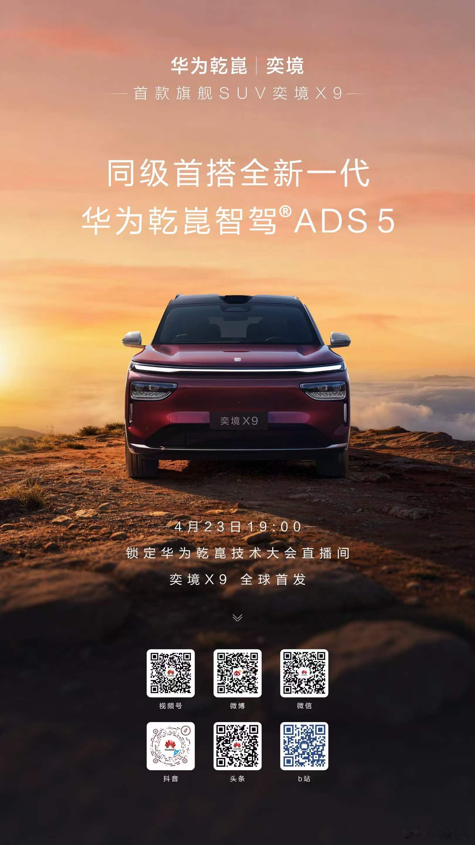 华为乾崑 | 奕境首款旗舰SUV——奕境X9,同级首搭全新一代华为乾崑智驾ADS 5,智领新境,重塑想象。4月23日19:00,邀您锁定华为乾崑技术大会直播间,共鉴旗舰,气势全开。 奕境X9首批搭载华为乾崑ADS5 华为乾崑技术大会 年度9系旗舰 华为乾崑首款旗舰SUV