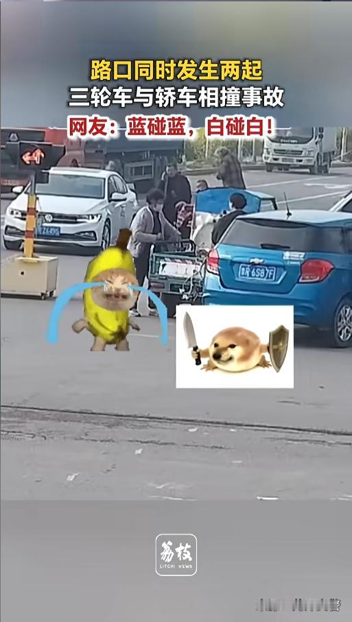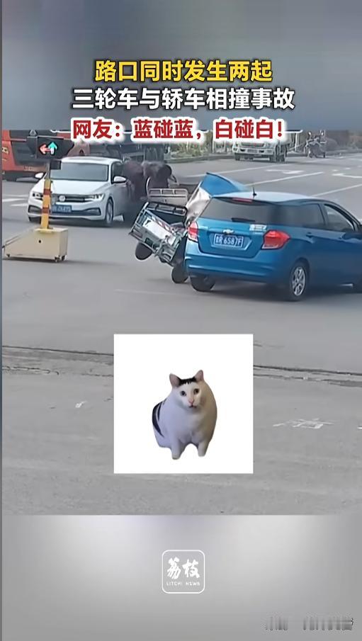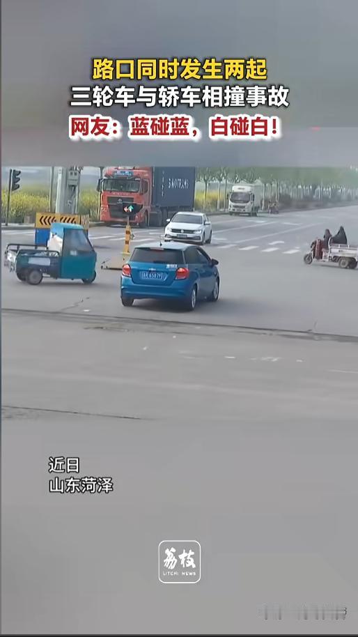 “不知道该哭还是该笑!”近日,山东菏泽,某路口同时发生了两场交通事故,堪称离奇。两辆汽车正常行驶,一白一蓝,这时候,另一个方向有两辆三轮车,闯红灯骑了过来,结果各自发生了碰撞。白车碰了白车,蓝车碰了蓝车! 据媒体4月22日报道,事发在一个十字路口,只有一个临时的红绿灯。一辆蓝色汽车在路上正常行驶,正要经过路口。这时候,对向车道上,也有一辆白色汽车驶来,马上就要通过路口了。 两辆汽车都是正常行驶,正好也是绿灯。另一个方向时,有两辆三轮车也行驶了过来,一白一蓝。 就在两辆汽车行驶到红绿灯路口时,这两辆三轮车也闯红灯冲了出来。从蓝色汽车的视角,白色三轮从右往左行驶,从它的车头前面驶过,撞上了白色汽车。 另一辆蓝色三轮,从左往右行驶,到了路口拐弯太急,车辆侧翻,撞上了蓝色汽车。一时间,四车两两相撞。白色三轮车车箱里还坐了个人,撞击瞬间,乘客和司机身体一同前倾,险些就栽了下去。 事故发生后,汽车驾驶员下车查看,看到眼前这一幕也十分无语。虽然没有人员受伤,但双方车辆却都受损了。 网友看后也说,好端端的,三轮车闯什么红灯啊!还好汽车的车速不快,不然三轮非得直接翻车不可!少不得又要有伤亡! 信息来源:《路口同时发生两起三轮车与轿车相撞事故 网友:蓝碰蓝,白碰白!》荔枝新闻