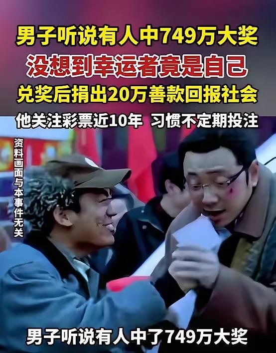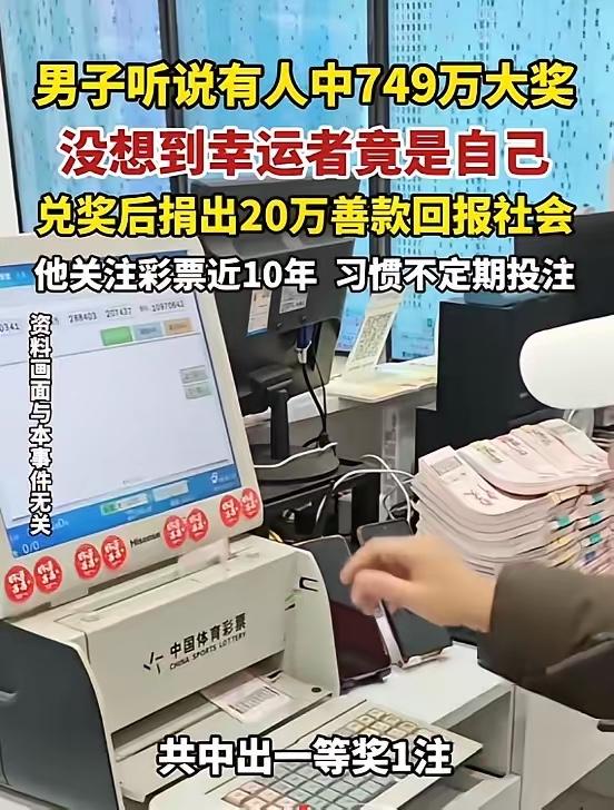 “这就是命啊!”山东济宁,一男子买了张彩票,周末的时候听说有人中了一等奖749.24万,他还在想是谁这么幸运,没想到一核对,发现中奖的是自己!他和家人办了兑奖手续,等领完奖以后,还捐了20万回报社会!网友:羡慕哭了! 金先生在济宁兖州生活,买大乐透有十来年了。他不是那种研究号码的“技术型”彩民,图个方便,每次就花十块钱,让机器随机选五组号码。有时忙,干脆一次买好未来两三期的,这叫“多期票”,买了就放兜里,常常忘了对奖。 4月13号下午,他在兖州鼓楼街道一家体彩店,花三十块机选了一张五注号码、连续三期的票。票打出来,他看都没看,跟往常一样揣进了口袋,这张小纸片很快就被他忘在脑后了。 几天后,大乐透开奖,消息在兖州传开了,有人中了一等奖,七百多万!金先生也听说了,跟朋友闲聊时还感叹,不知道哪个幸运儿这么好命。他完全没往自己身上想。 4月19号他又去体彩店买下一期的票,店里人还在聊这个大奖,说大奖得主一直没露面。金先生心里忽然一动,鬼使神差地摸出钱包,翻出那张有点旧的“多期票”,他一个数一个数地对着墙上的开奖公告。 看了一遍又一遍,前区全对,后区也对。他拿着彩票的手,有点不听使唤了。他把票递给熟悉的销售员:“你……帮我瞧瞧,是这几个数不?” 销售员接过来仔细核对,眼珠子都瞪出来了,拍了他一下:“老金!是你啊!大奖就是你中的!” 金先生站在那儿脑子里一片空白,回家的路上,脚步都是飘的。跟家人一说,老婆孩子全傻了,反复确认了好几遍,才敢相信这不是做梦。 第二天金先生在家人陪同下,去了省体彩中心。兑奖手续办得挺快,扣完税,一笔能改变生活的巨款就算落定了。工作人员问他这笔钱打算怎么安排。金先生话不多,想了想,很实在地说:“这钱是天上掉的运气。我琢磨着,不能全揣自己兜里。”他当场决定,捐出二十万,给公益事业。数目不算多,但他说,就想给那些比他更难的人一点点温暖。 这个故事最让人感慨的,还不是那七百多万的运气。是他那种十年如一日的坚持。买了十年,每次十块二十块,从不研究,中了是惊喜,不中就当给公益做贡献了,心态特别平。恰恰是这种不惦记、不强求的平常心,等来了最大的惊喜。 中大奖后也没飘,还能想到捐一笔,这份朴素的善念,比彩票本身更珍贵。我们天天做着“一夜暴富”的梦,可真有馅饼砸头上时,有多少人能像他一样,接住了还能分出一块给别人? 买彩票就是个概率游戏,一千万人里也未必有一个金先生。他的故事,当个茶余饭后的奇谈听听挺好,可别真当成人生规划。日子终究得靠踏踏实实一天天过。那份中了是运气、不中是常事、得了福不忘回馈的平和,才是比任何头奖都靠谱的生活哲学。 各位读者你们怎么看?欢迎在评论区讨论。