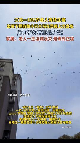 “科学都解释不清了!”江苏徐州,一102岁老人,一生无病无灾,寿终正寝,没想到,出殡下葬前,灵棚上空突然飞来 数十只大鸟,哀鸣盘旋,持续了3分钟才飞走。家属一番话,让人顿悟。 老人一生行善,待人宽厚,帮乡邻、助孤寡,一辈子没红过脸,活到百岁无病无灾,走得安安静静。 群鸟相送不是迷信,是人心最暖的回响。 一辈子积德行善,自带福气,连天地万物都在为她送别。 人这辈子,最好的风水是人品,最大的福报是善良。你温柔待世界,世界必会温柔送你。