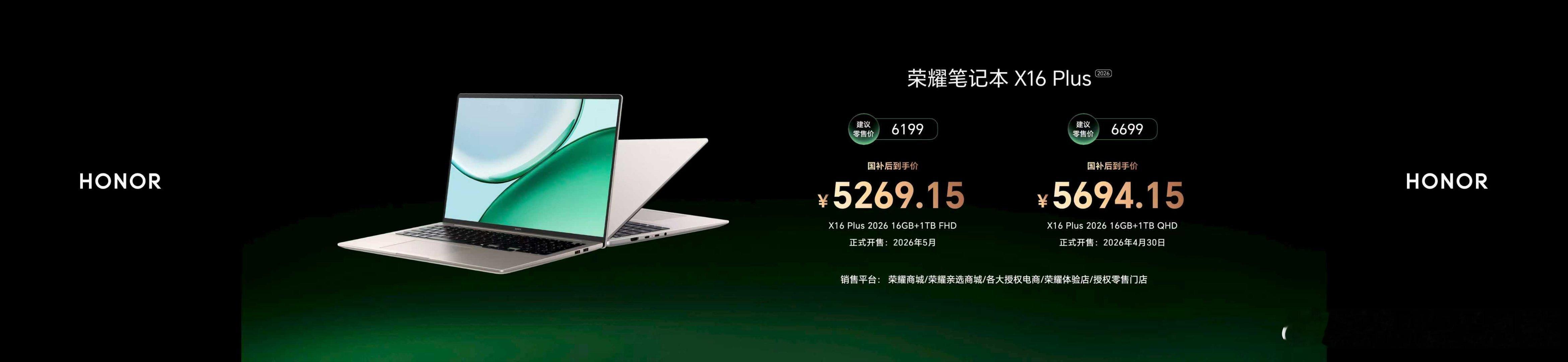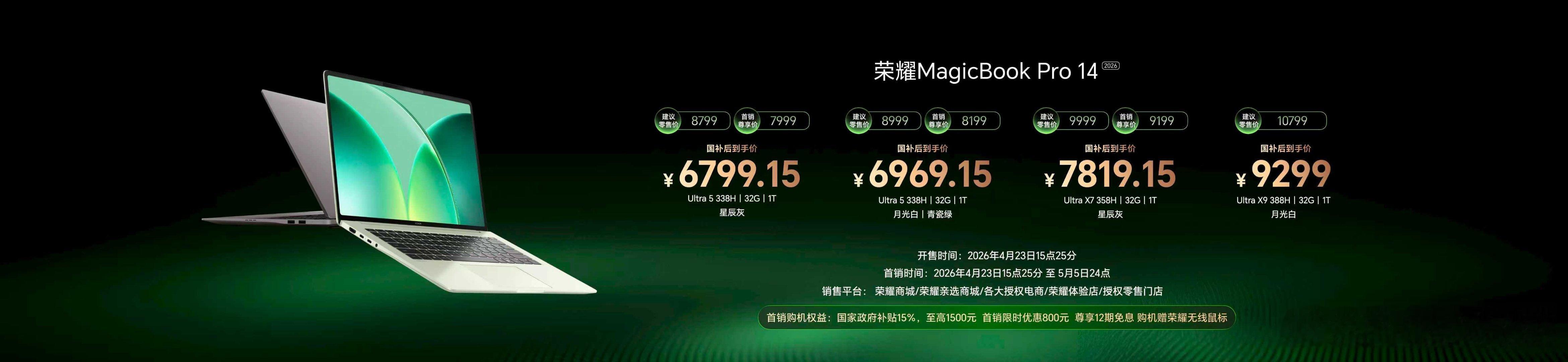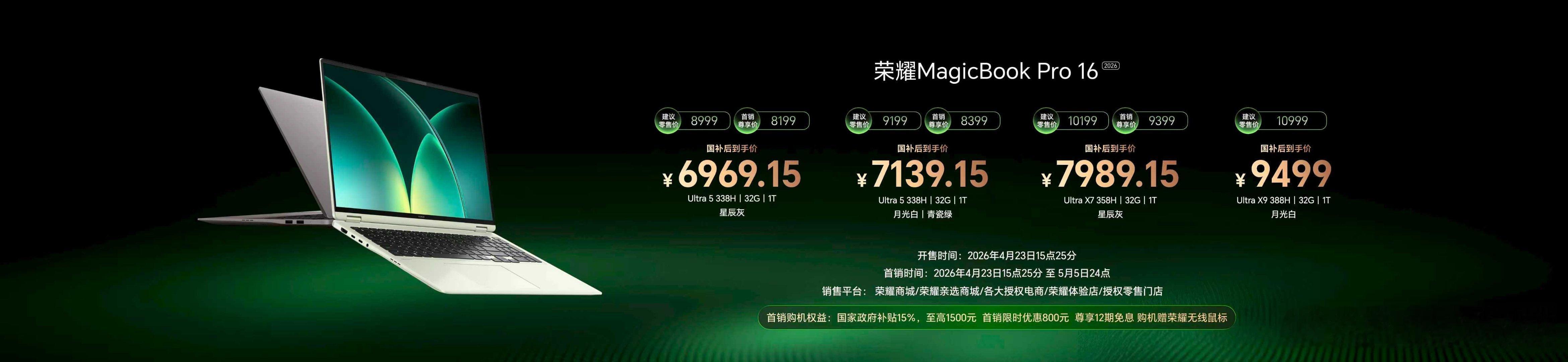 荣耀游戏本家族两大成员价格揭晓:H9版5月6日首销,国补后9999元起步;H7版现已在售,入手价7819.15元起。轻薄旗舰方面,MagicBook Pro 14和16国补后分别为6799.15元、6969.15元,均已开售。X Plus系列5099.15元起,4月30日陆续到货。另有MagicPad 3 Pro平板,12.3英寸超薄设计,国补后3499元,4月30日首销。打洲本还得看荣耀WIN荣耀WIN游戏本荣耀MagicBook Pro 14