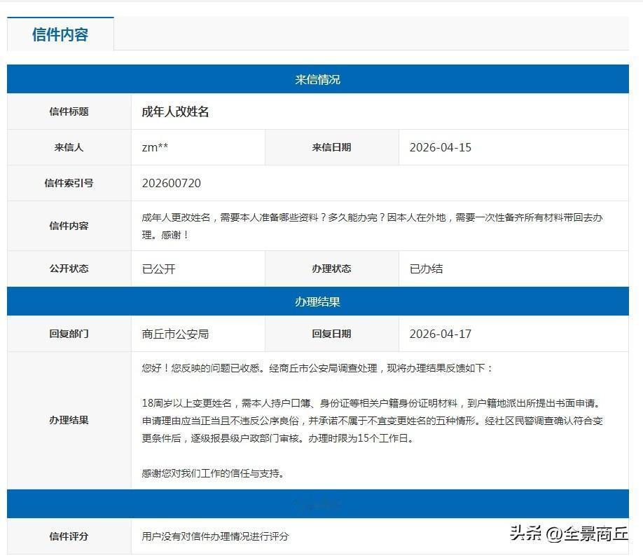 【商丘公安局关于变更姓名咨询的回复】您好!您反映的问题已收悉。经商丘市公安局调查处理,现将办理结果反馈如下:18周岁以上变更姓名,需本人持户口簿、身份证等相关户籍身份证明材料,到户籍地派出所提出书面申请。申请理由应当正当且不违反公序良俗,并承诺不属于不宜变更姓名的五种情形。经社区民警调查确认符合变更条件后,逐级报县级户政部门审核。办理时限为15个工作日。感谢您对我们工作的信任与支持。(via商丘市人民政府网站)