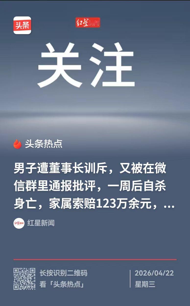 被领导训斥后自缢!上海一名男子,是公司中层管理,只因报销一事,和领导发生争执,当众被狠狠训斥。事后,领导还在群里公开通报,彻底扫了他的颜面。男子自尊心受挫,心结越压越重。一周后,他跟母亲提起这件事,情绪里已经带着轻生的念头。母亲一听吓坏了,急忙联系公司负责人,恳求对方劝劝儿子,别做傻事。可最终,劝阻没能及时赶到。当天下午,男子在林中自缢。家属认为,公司未尽到安抚、干预义务,应当担责,索赔123万。最终,法院判了。 2026 年 2 月,上海某城区法院庭审现场,电子屏幕上的赔偿相关数额正在不断滚动更新。 法院最终敲定的赔付总额为 97582.5 元,而短短数月之前,死者家属索赔金额高达 123 万,前后差额差距大到惊人。 身亡男子的身份,为上海某在职企业的中层行政管理者。那天,他因为报销单据的问题,和领导发生了争执。 这本来是再普通不过的职场摩擦。 谁没和财务报销过不去呢?可问题是,这位领导直接把话撂在了桌面上——当众训斥,言语凌厉。 更要命的是,他还把批评性通报发到了高管工作群里。线上线下双重夹击,员工的面子碎了一地。 一周的时间,足够让一个人的精神状态滑向深渊。 当日清晨,一通来自儿子的电话打到了母亲手中,听筒里传来的低落状态,瞬间就让她的心情跌落到冰点。“想死”两个字清清楚楚地传进耳朵。 她慌了神,挂掉电话后立刻拨通了公司负责人的号码。请求他们管一管,看看儿子的动向,帮忙做做心理疏导。 面对母亲焦急的求助,涉事企业全程闭口不言,没有给出任何答复与回应。 就在同一天的午后,一名路人在城郊野外的林地之中,找到了已经离世的他。 悲痛万分的母亲,毅然选择拿起法律武器,将涉事企业起诉至法院。 她认为,正是那次公开羞辱和群内通报,让儿子精神崩溃。 而公司收到求助信号后毫无作为,等于亲手关上了最后一道安全阀。123万的索赔金额,是她能想到的最强烈的诉求。 法院调阅了《民法典》第1165条。 条文的逻辑很清楚:行为人因过错侵害他人民事权益造成损害的,应当承担侵权责任。关键在于“因果关系”四个字。 法官承认,公司的管理方式确实失当。公开训斥员工,在群里通报批评——这些行为无疑是在员工的伤口上撒盐。母亲打来求助电话后,企业行政机器的停滞也令人遗憾。这些都构成了管理上的污点。 但法律要追问的是:这种污点,和死亡结果之间,是否存在必然的、直接的因果关系? 答案是否定的。 法院的逻辑是,职场压力、心理创伤,这些因素可能导致情绪失控,但不必然、直接导致自残。员工的精神状态是多因素叠加的结果,公司管理失当只是其中一个变量。 要求企业对每一个员工的每一个极端选择负全责,超出了因果关系的合理边界。 最终,法院驳回了123万的赔偿诉求,裁定公司支付约9.7万元的人道主义补偿。 这个数字让很多人觉得憋屈。公司的行为明明有问题,为什么只赔这么点? 因为法律划定的是责任红线,而不是道德评判。公司确实做错了,但这不等于它是导致悲剧的唯一原因。职场羞辱是导火索,不是扳机。 这个案子的警示意义在于:它划出了一片危险区域——企业在这里没有法律责任,但管理污点清晰可见。 当员工的求助电话石沉大海,当情绪崩溃的信号被行政流程吞噬,企业或许能躲过法律赔偿,却躲不过道德审视。 123万与9.7万之间,隔着的不是数字,而是一条关于职场伦理和人性温度的深深裂痕。 信源:红星新闻