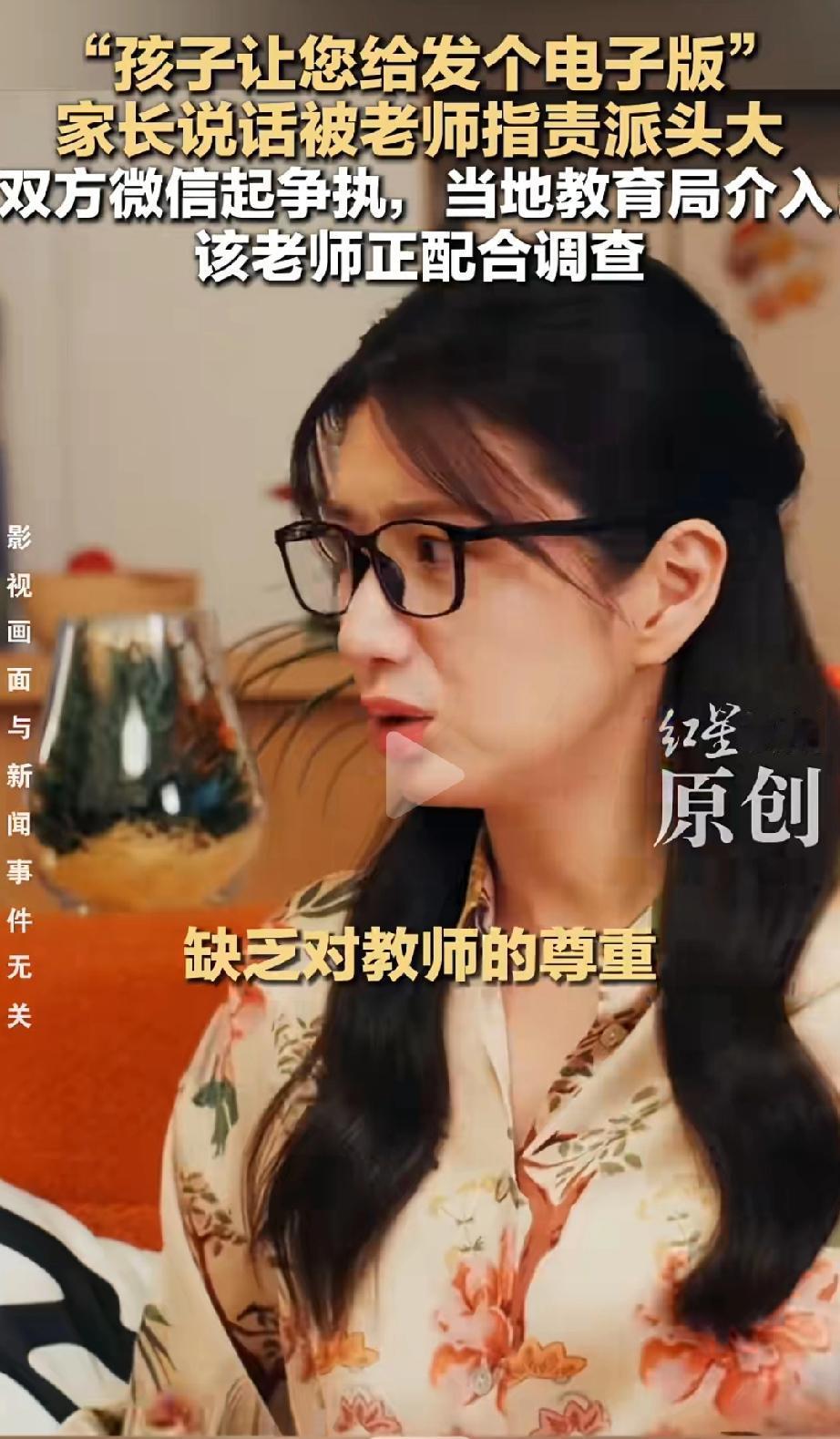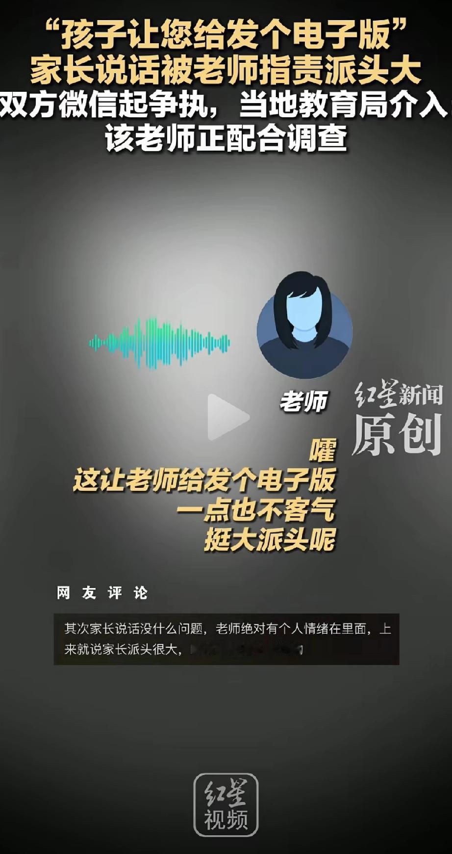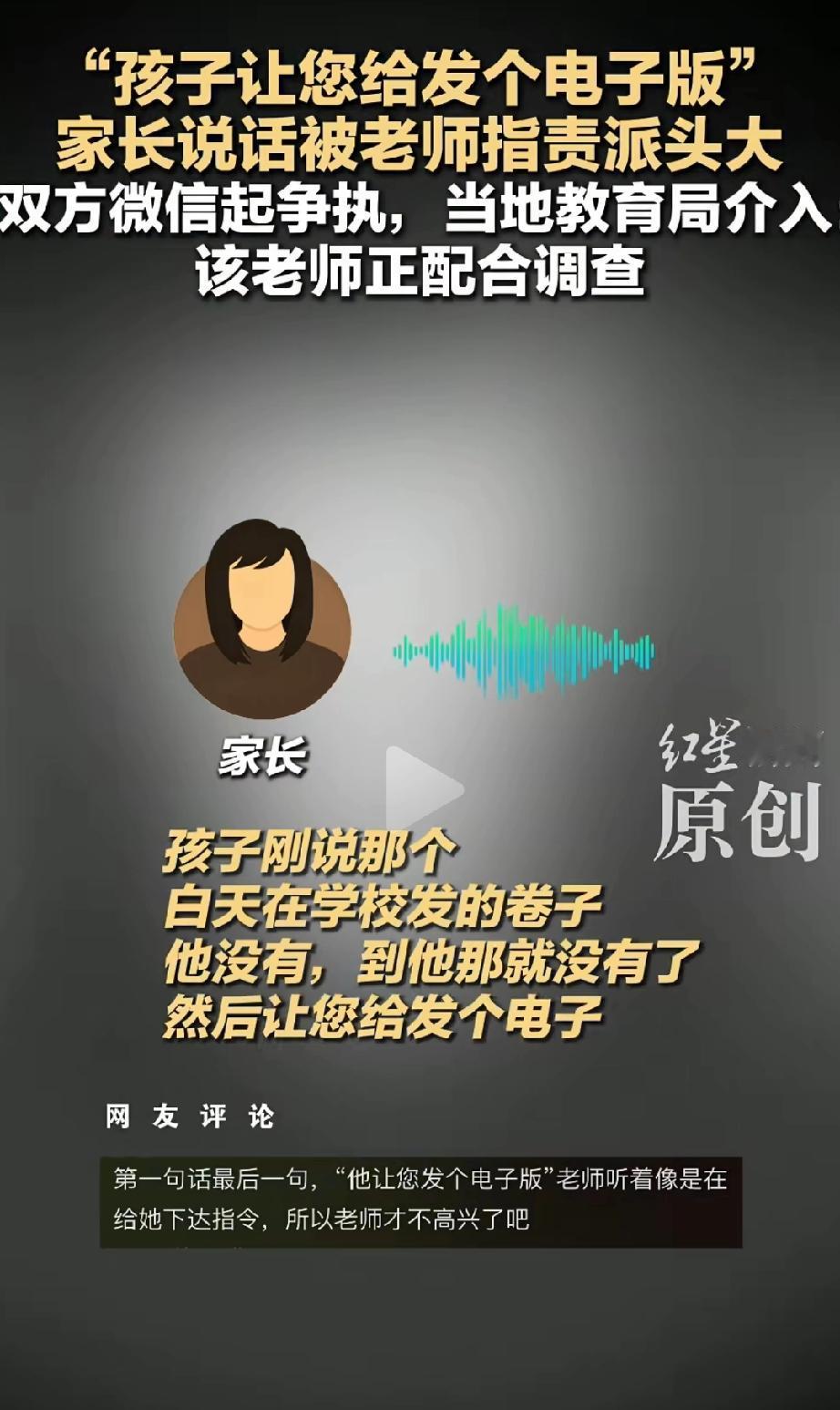 挺大派头!天津,一孩子回家给父母说白天学校发卷子到他这里,就没有了,家长微信上转告孩子的意思,想老师给份电子版,万万没想,老师劈头盖脸骂“一点不客气,挺大派头”,还说家长“把老师当服务员” ! 视频里家长晚上听孩子说白天老师发试卷时,就他一个人没领到,特别着急,让家长问问老师能不能发份电子版。 家长挺实在,直接在微信上找了老师,原话是:“白天发的试卷孩子没有领到,麻烦您帮忙发一份电子试卷”,全程都用“您”称呼老师,语气特别客气。 结果老师秒回,火气超大:“你这话说得一点不客气,挺大派头啊!”还说自己已经下班了,根本没有电子版试卷,指责家长“把老师当服务人员了” 。 家长当场懵了,赶紧解释自己全程用“您”,没半点不尊重,只是转达孩子的请求。 可老师不依不饶,两人越吵越凶,最后家长气不过,把聊天记录和录音都发了出来,一下子就火遍全网 。 现在天津市津南区教育局已经介入,那位老师也暂时离开课堂,配合调查呢 有网友说:“孩子没拿到卷子,本来就是老师发卷子时的失职。家长要个电子版补上,有啥问题?” 也有网友说“老师下班了没错,但孩子没卷子这事儿总得解决吧?电子版没有,拍个照片也行啊。” 还有网友说:“跟老师说话得用‘请’‘麻烦’这样的词,直接说‘发个电子版’确实有点硬。” 在我看来家长真没毛病。反倒是老师那句“派头真大”,听着就让人不舒服。孩子没拿到卷子,家长问一下怎么了?这要是算派头大,那以后谁还敢跟老师说话? 老师和家长,本来是同一战线的战友,目标都是让孩子学好,怎么就变成仇人了呢? 其实说白了,这事儿根本不是多大的事。孩子没卷子,家长问一声,老师回答“不好意思,我手里也没有电子版,明天让孩子补领一下”,不就完事了吗?非要上纲上线说人家“派头大”,这不是自己找不痛快吗? 尊师重教是没错,但尊重是相互的,不是单方面的讨好。老师确实辛苦,但家长也不是敌人。彼此多一点理解和耐心,少一点敏感和对抗,孩子才能在一个健康的环境里成长。