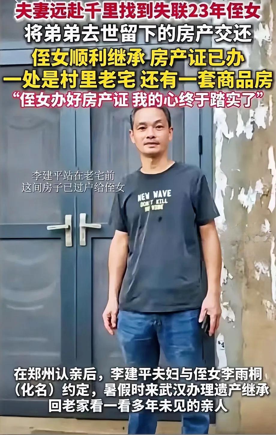 武汉一男子,弟弟病逝,留下百万遗产,交由哥哥处置。谁成想,月入6000的哥哥,办完弟弟的丧礼说:“我要去找一个人,把这些遗产都交给她。” 这个男人叫李建平,是武汉蔡甸区索河街道梅池村的一名普通装修木工,每月收入稳定在6000元左右。妻子乐小红从事家政工作,夫妻俩日子过得不算宽裕,一儿一女都在外务工,还要兼顾家里老人的日常开销,每一分钱都要掰成两半花。 2024年4月21日,他51岁的弟弟李国平因病突然离世,没有留下一句遗言,只留下了一套蔡甸城区140平米的拆迁商品房、老家一套自建房,还有一笔数额不小的存款,总价值超过百万。 李建平要找的人是弟弟李国平的女儿李雨桐,这个侄女他从未见过,叔侄俩整整失联了23年 。李国平早年在郑州打拼时结婚生女,女儿一岁时夫妻离异,此后父女再无交集,这份亲情被时间和距离彻底隔断 。 家族里不少亲戚都劝李建平,干脆把遗产转到自己子女名下,毕竟侄女失联多年,找起来既费钱又费力,甚至可能根本找不到 。这些话听着实在,对经济不宽裕的李建平家来说,百万遗产足以彻底改善生活,换谁都会动心 。 李建平当场就严词拒绝了这些提议,他拍着胸脯跟亲戚们说:“弟弟的血脉不能失联,这些财产本就属于他的女儿,无论多难,都要找到孩子,把遗产原封不动交还” 。妻子乐小红也全力支持丈夫,夫妻俩连夜就开始整理弟弟留下的遗物,希望能找到侄女的线索 。 他们翻遍了李国平的所有证件和信件,只找到一张20多年前的旧照片,照片上是年幼的侄女和她母亲,连具体地址都没有 。李建平没放弃,他跑到蔡甸公证处咨询继承手续,又联系郑州警方和社区求助,一步步缩小寻找范围 。 为了凑齐寻亲费用,李建平主动多接了好几单装修活,每天加班到深夜,手上的老茧又厚了一层,妻子乐小红也利用休息时间多做了几份家政兼职。夫妻俩心里只有一个念头,一定要完成弟弟的遗愿,让他的血脉能继承这份家产 。 2025年2月28日,李建平夫妇带着所有证明材料,跨越500多公里从武汉赶到郑州,在当地警方和社区的帮助下,终于找到了已经24岁的侄女李雨桐 。见面时李建平掏出房产证和存款单,双手递到侄女面前,声音哽咽地说:“孩子,这是你爸爸留给你的,我们给你送来了” 。 李雨桐当场就哭了,她从小就没见过父亲,更不知道父亲留下了这么多遗产,她握着李建平的手反复说谢谢,这份迟到23年的亲情让在场所有人都为之动容 。随后李雨桐在蔡甸公证处办理了继承手续,顺利拿到了两处房产和存款。 这件事很快在梅池村传开,村民们都在微信群里为李建平夫妇点赞,说他们是村里的骄傲,用行动诠释了什么叫信义夫妻 。新华网、湖北日报等权威媒体也报道了他们的事迹,夫妻俩还被评为“湖北好人”,成为无数人学习的榜样 。 现实中太多人为了遗产反目成仇,兄弟姐妹闹到对簿公堂的案例比比皆是,李建平夫妇的选择就像一面镜子,照出了人性中最珍贵的善良和坚守 。他们月入6000却能抵住百万诱惑,这种精神比任何财富都更有价值,更值得我们传承 。 各位读者你们怎么看?欢迎在评论区讨论。