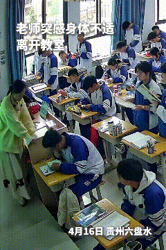 “泪目!”近日,贵州六盘水一高中老师上课时,突感身体不适,她怕吓到学生强撑着往外走,谁知全班同学一路悄悄跟随,在老师即将倒下的瞬间,同学们的举止令无数人破防! 网友:这才是教育最好的样子! 2026年4月16日早上8点10分,贵州六盘水青云学校高二(6)班的英语课正在进行。任课老师张富美,是一位用心扎根课堂的00后年轻教师。 前一晚她熬夜批改完全班的试卷,第二天一早忙着赶去上课,连一口早饭都没顾上吃。身体过度劳累再加上空腹,直接诱发了低血糖,身体瞬间就撑不住了。 张老师回忆当时的感受,说自己浑身冒冷汗、天旋地转,连方向感都快没了。她第一反应不是顾自己,而是怕晕倒吓到学生,更不想打乱课堂秩序,只轻声对同学们说:“你们先自学一下。” 说完她就借助桌子和墙壁支撑,脚步发虚地走出教室,本想独自去对面空教室缓一缓。她全程刻意放慢动作、压低身形,就是不想引起课堂骚动,不想让学生们因为担心自己而分心走神。 9名男生敏锐地发现了老师的异样,没有大声喧哗,也没有盲目慌乱,只是默默起身跟在老师身后。这群高中生心思细腻,他们能察觉到老师的不适,也懂得用安静的方式守护老师。 就在张老师走到空教室门口、意识模糊即将倒地的瞬间,9名男生立刻上前,合力稳稳托住了她。他们没有丝毫犹豫,没有半点退缩,这份本能的举动全是发自内心的关心。 之后有学生赶紧去找校医,有人拿来糖果和温水,还有人一直在旁边轻声呼唤老师,直到老师慢慢恢复意识。监控画面记录下的这几秒钟,成了全网热议的暖心瞬间,彻底戳中了无数人的心。 张老师事后回看监控才知道是学生们救了自己,她直言“当时其实一点知觉都没有,真的是从内心里面十分感动”。学校工作人员也证实,张老师吃了点东西后已无大碍,校方将公开表扬这9名有担当的学生。 当下很多人评判教育好坏,只盯着升学率、分数排名这些硬性指标,这种单一标准彻底忽略了教育中情感滋养、品德培育的核心意义。把教育完全功利化、分数化,是当下教育认知里最可怕的误区。 教育的本质从来不是培养只会考试的机器,而是教会孩子懂得尊重、学会感恩。张老师用责任与关爱浇灌学生成长,学生用感恩与行动回馈老师付出,这种双向的情感奔赴,才是教育最珍贵的价值。 那些只重成绩、不重育人的教育方式,终究会让教育失去原本的温度。唯有真心换真心,才能成就最动人、最健康的师生关系,这也是任何分数都换不来的教育成果。 各位读者你们怎么看?欢迎在评论区讨论。