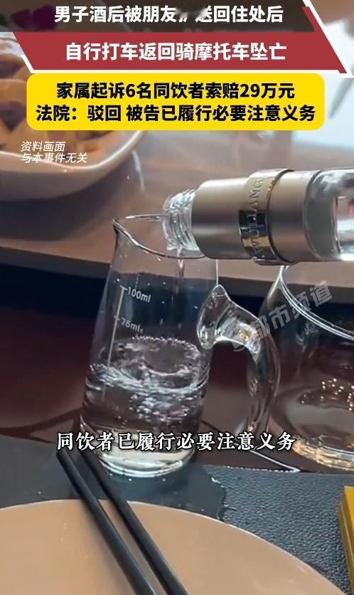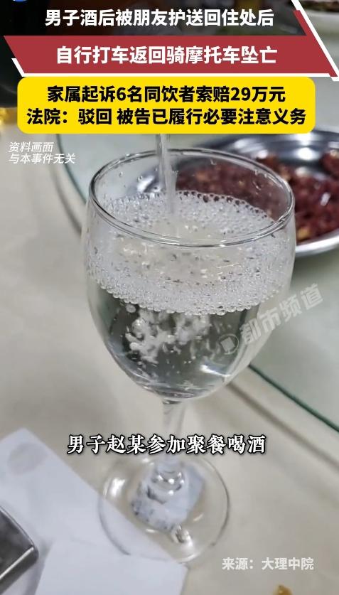 酒桌如战场?一场聚餐喝出人命,6个酒友被告上法庭,29万索赔竟一分没拿到!法官的话,每个爱喝酒的都该听听…… 河南的赵某怎么也想不到,一场普通的亲友聚餐,会是自己人生的终点。那天晚上,他和6个熟人围坐一桌,酒杯碰得叮当响,你敬我劝间,赵某喝得满脸通红,说话都打了哆嗦。 散场时,朋友们看他醉得站不稳,特意轮流扶着,把他安全送回了住处,临走前还反复叮嘱“千万别再出门”。谁曾想,这叮嘱成了耳旁风——赵某躺了没多久,竟偷偷打了辆车,跑回自己放摩托车的地方,迷迷糊糊就拧了油门。 结果可想而知,深夜的乡间小路看不清路,摩托车一头扎进路边深沟,等被发现时,赵某已经没了气息。 家属哭天抢地,觉得是酒友们没看住人,一纸诉状把6人告到法院,张口就要29万赔偿。法庭上,家属说“你们不该让他喝那么多”,可酒友们拿出聊天记录,全是“少喝点”“别逞能”的劝酒话;家属说“你们该锁着他不让走”,可谁能想到一个成年人会半夜偷跑出去? 法院审理后,一句话定了调:酒友们送他回家、反复提醒,该做的都做到了。赵某是完全民事行为能力人,该知道酒后骑摩托等于玩命,自己非要闯祸,责任只能自己担。一审、二审,家属的诉求全被驳回。 这事儿看得人心里堵得慌。酒这东西,少喝是情谊,多喝是祸根。朋友聚餐图个热闹,可没人该为别人的“作死”买单。你逞英雄灌下的每杯酒,你酒后不听劝的每个决定,背后都是家人的眼泪。 成年人的世界,“我乐意”三个字,从来不能当免责金牌。 你见过最离谱的酒局闹剧是什么?遇到朋友酒后要做危险事,你会硬拦吗?评论区聊聊,赞同法官判决的,别忘了点赞转发,让更多人明白:酒桌上,最大的体面是懂得对自己负责! 酒局酿悲剧谁该担责 成年人的责任边界 聚餐喝酒必看提醒 信息来源:河南都市频道。 图片来源:大理中院、河南都市频道,如有侵权,请联系删除。