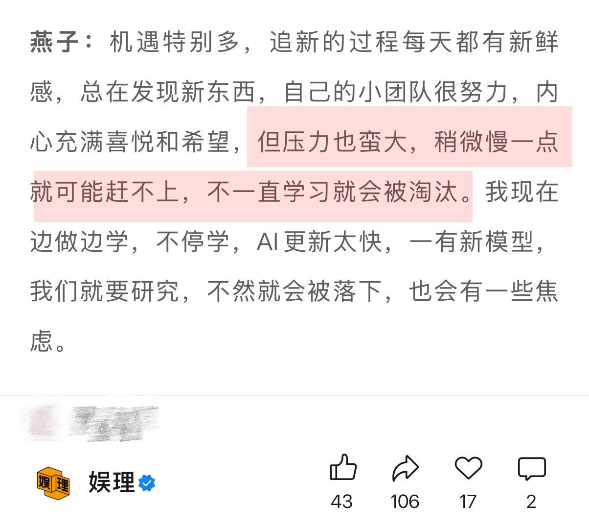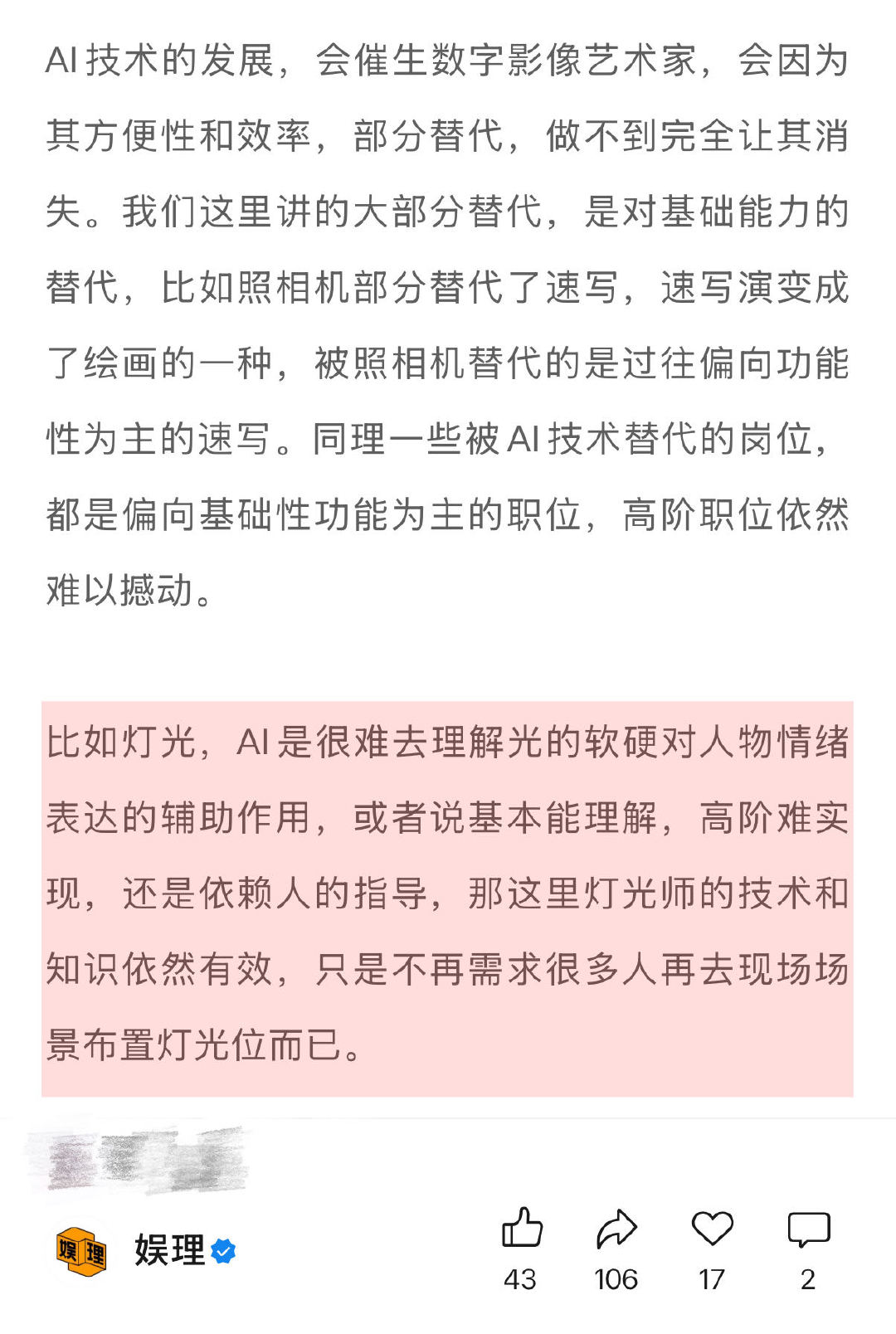 导演说观众反感的不是AI而是劣质内容 业内谈会被AI替代的传统影视岗位 当被问及“AI导演未来会不会也被取代”时,小光举了个例子:摄影技术和照相机的诞生,并没有取代画家,而是催生了摄影师和摄影艺术。“AI替代的都是偏基础性、功能性为主的职位,高阶职位依然难以撼动。比如灯光师对光软硬影响人物情绪的理解,AI基本无法实现高阶应用。”