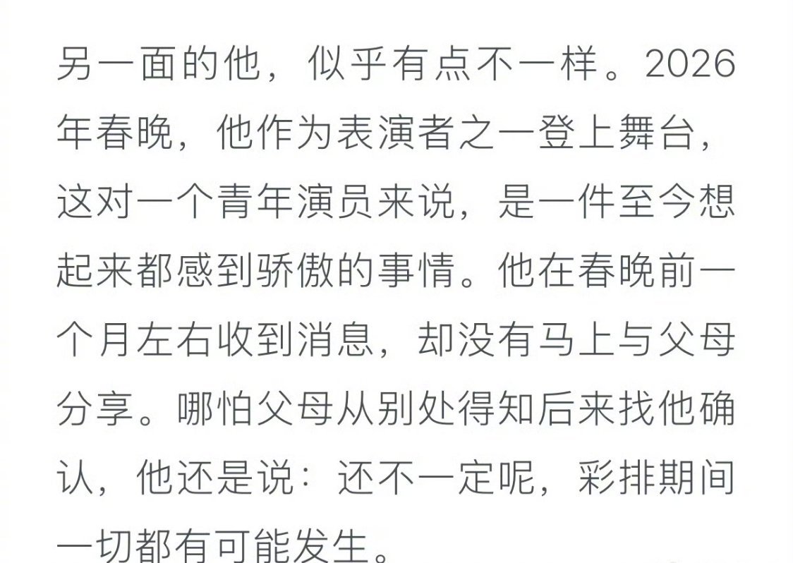 李昀锐没马上告诉父母要上春晚李昀锐采访透露,收到春晚邀约后没有立刻告诉父母,怕彩排有变数,等确定后才安心~拍戏每场只抓一个重点,把信息演透就好,沉稳又清醒。李昀锐从李雪健身上学到不贪心