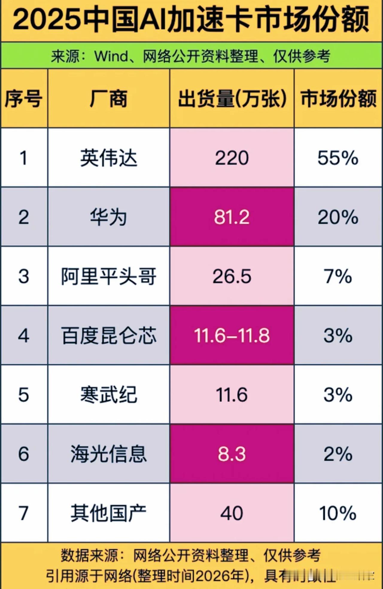 从95%到55%:英伟达失守,国产AI加速卡迎来「史诗级反杀」?! 先给大家看一组数据:2025年中国AI加速卡市场,英伟达出货220万张,份额55%;而国产阵营合计拿下41%的市场,仅华为一家就出货81.2万张,占比20%,几乎是英伟达的三分之一。 这组数据放在三年前,想都不敢想。毕竟,制裁前英伟达在中国AI加速卡市场的份额一度高达95%,几乎是「说一不二」的绝对霸主。而现在,国产厂商用400万张总出货量里的165万张,硬生生撕开了一道口子。 很多人只看到「国产份额破40%」的爽感,但我更想聊聊这张表里藏着的三个「冷真相」。 1. 不是「一家独大」,而是「三足鼎立」的国产新生态 国产阵营里,华为昇腾81.2万张的出货量,是绝对的领跑者,占了国产总量的近一半。但有意思的是,紧随其后的不是其他传统芯片厂,而是阿里平头哥(26.5万张)、百度昆仑芯(约11.7万张),再加上寒武纪、海光信息,还有「其他国产」的40万张。 这不是单一厂商的突围,而是「云厂商+传统芯片厂+通用算力厂商」的集体爆发。 - 华为昇腾:靠着完整的「芯片+服务器+框架+智算中心」全栈方案,吃了大部分国资、运营商的订单; - 阿里、百度:一边为自家大模型「自给自足」,一边把富余的算力对外销售,顺便吃下了中小客户的市场; - 寒武纪、海光:靠着细分场景的适配,啃下了推理、通用计算的部分市场。 这种「多线开花」的格局,意味着国产AI加速卡已经不是「单点突破」,而是形成了覆盖训练、推理、通用计算的完整生态。 2. 英伟达的「份额缩水」,不全是制裁的功劳 很多人说,英伟达份额从95%跌到55%,是因为美国的出口管制。这话没错,但不全对。 制裁确实是重要推手——英伟达被迫推出性能阉割的H20、L20,价格却没降多少,很多企业买不到、也买不起。但更关键的是,国产加速卡已经从「能用」走到了「好用」。 比如华为昇腾的Atlas系列,推理性能已经能对标英伟达的同级别产品;阿里平头哥的倚天芯片,在云场景的性价比优势越来越明显;甚至DeepSeek这类头部大模型,都已经把底层框架从CUDA迁移到了国产的CANN。 客户的选择,从来都是「谁好用、谁划算,就选谁」。当国产芯片不仅能满足需求,还能提供更低的成本、更好的本地化服务时,份额的反转只是时间问题。 3. 41%不是终点,而是「从量变到质变」的起点 很多人盯着「41%」这个数字欢呼,但我想说,这只是国产替代的「上半场」。 - 从份额看,国产已经拿下近半壁江山,但从高端训练卡市场来看,英伟达的优势依然明显; - 从生态看,国产框架的开发者数量、软件适配度,和CUDA生态还有不小差距; - 从竞争看,英伟达也在不断推出新的适配产品,试图守住中国市场,国产厂商不能掉以轻心。 但不可否认的是,国产AI加速卡已经完成了「从0到1」的跨越,接下来的「从1到10」,才是真正的硬仗。 有人说,这是美国制裁逼出来的「奇迹」;也有人说,这是中国算力自主的必然结果。 在我看来,它更像是一场「双向奔赴」:一边是外部压力倒逼我们加速自研,一边是市场需求推着国产芯片不断迭代。 未来几年,随着国产厂商的持续发力,英伟达的份额可能还会继续下滑,而国产阵营的竞争也会越来越激烈。但无论格局如何变化,有一点是确定的:中国AI算力的「命门」,再也不会被别人牢牢攥在手里了。 你觉得,国产AI加速卡能在未来3年内超过英伟达吗?评论区聊聊你的看法。 AI加速卡 国产芯片 算力自主
