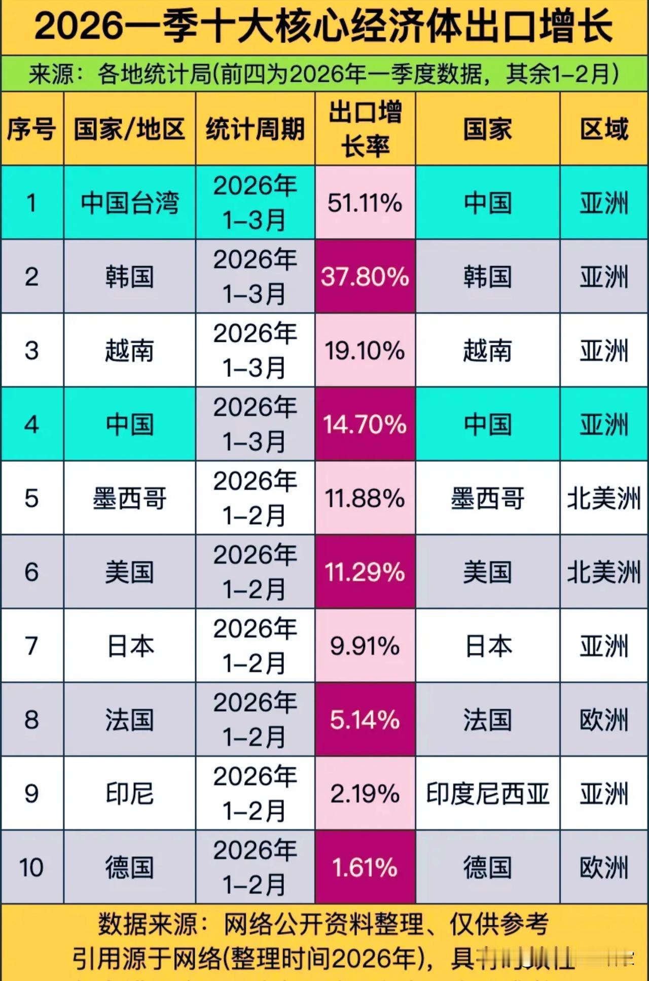 2026一季度出口数据:亚洲杀疯了,欧美在「躺平」?! 亚洲经济体直接「霸榜」,而欧美老牌强国的增速,却显得有些「后劲不足」。 先上数据,感受一下这份「割裂感」: 1. 中国台湾:51.11% 2. 韩国:37.80% 3. 越南:19.10% 4. 中国大陆:14.70% 5. 墨西哥:11.88% 6. 美国:11.29% 7. 日本:9.91% 8. 法国:5.14% 9. 印尼:2.19% 10. 德国:1.61% 🔍 这张表里,藏着三个被大家忽略的「冷真相」 1. 亚洲不是偶然爆发,而是踩中了「同一风口」 很多人只看到亚洲国家增速快,却没意识到,这背后是同一个核心引擎——AI与半导体产业链的超级景气周期。 - 中国台湾、韩国,靠的是半导体和AI相关零部件的订单爆发,尤其是高端芯片、存储产品的出口,直接把增速推到了离谱的50%和37%。 - 越南、中国大陆,则是吃了全球电子制造和新能源产业链的红利,从AI服务器、消费电子到光伏产品,订单量肉眼可见地涨。 这不是某一个国家的胜利,而是整个亚洲电子制造集群,吃到了全球AI算力建设和消费电子复苏的双重红利。欧美国家看似在复苏,但真正能跟上这波技术周期的产业,已经不多了。 2. 美国和墨西哥的增长,本质是「区域抱团」的结果 你可能会疑惑,美国和墨西哥增速怎么也这么靠前? 这其实是近岸外包和北美自贸区的胜利。美国企业为了供应链安全,把产能往墨西哥转移,墨西哥对美出口暴涨,美国自己的进口替代和制造业回流,也拉动了出口数据。 但这种增长,更像是「区域内循环」,和亚洲那种面向全球的产业红利,本质上不是一回事。一旦美国国内需求疲软,这种增长的可持续性,就要打个问号。 3. 欧洲的「慢」,不是暂时的,而是结构性的 德国1.61%、法国5.14%的增速,放在榜单末尾,看着有点刺眼。 很多人会说,欧洲是被能源问题拖累了,但我觉得更核心的原因,是欧洲正在错过新一轮技术周期的红利。 全球AI、半导体、新能源的产业链,都在往亚洲集中,欧洲的传统优势产业,比如汽车、高端制造,正在面临中国和亚洲新兴市场的双重竞争。当全球都在为AI算力砸钱的时候,欧洲能拿出手的、能打的出口产品,越来越少了。 💡 聊点更现实的:这对我们意味着什么? 很多人看到大陆14.7%的增速,觉得不如台韩亮眼,有点焦虑。 但换个角度看,我们的出口结构,正在悄悄升级。除了传统的机电产品,新能源汽车、光伏、锂电池,还有AI服务器相关的零部件,占比越来越高。我们不是在靠单一产品冲数据,而是在靠全产业链的优势,稳扎稳打。 台湾省和韩国的高增速,很大程度上依赖全球芯片周期,波动会很大;而我们的出口,是在不断拓宽赛道,抗风险能力反而更强。 说到底,这份数据不是简单的「谁快谁慢」,而是全球产业格局正在重塑的缩影。 亚洲靠着电子制造和AI产业链,正在重新拿回全球贸易的主导权;而欧美,尤其是欧洲,正在为过去几年的产业空心化买单。 接下来几年,谁能跟上技术周期,谁能守住产业链优势,谁的出口数据就不会差。 你觉得,这波亚洲出口的高增长,能持续多久?评论区聊聊你的看法。 出口数据 全球贸易 经济观察 半导体周期