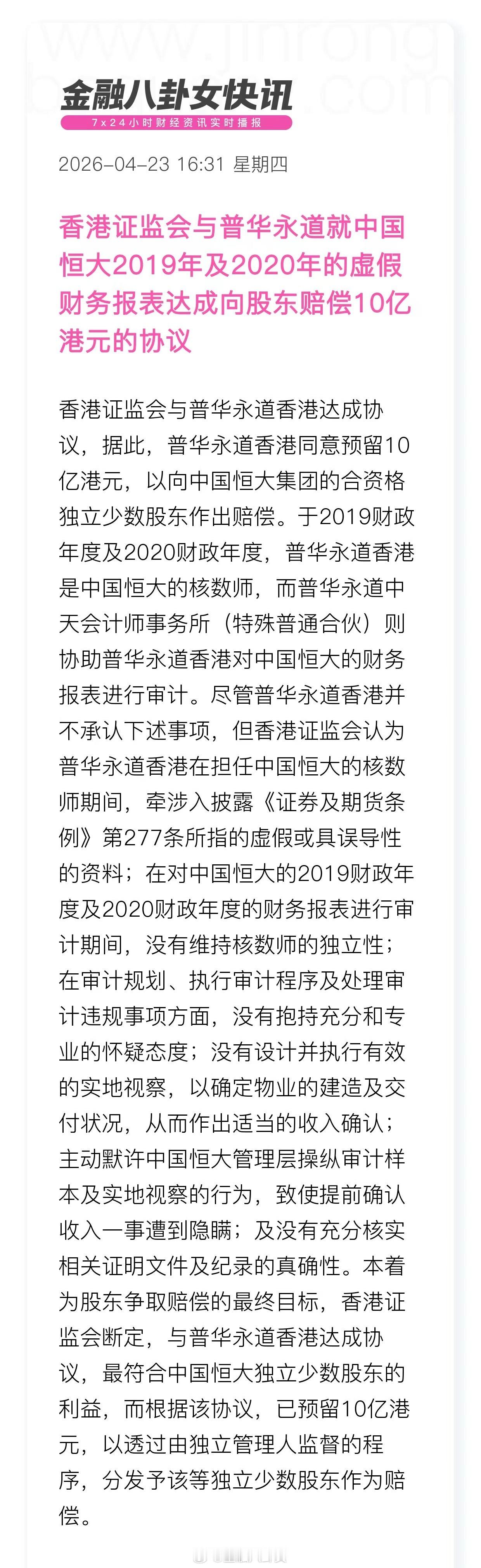 香港证监会与普华永道就中国恒大集团2019年及2020年的虚假财务报表达成向股东赔偿10亿港元的协议