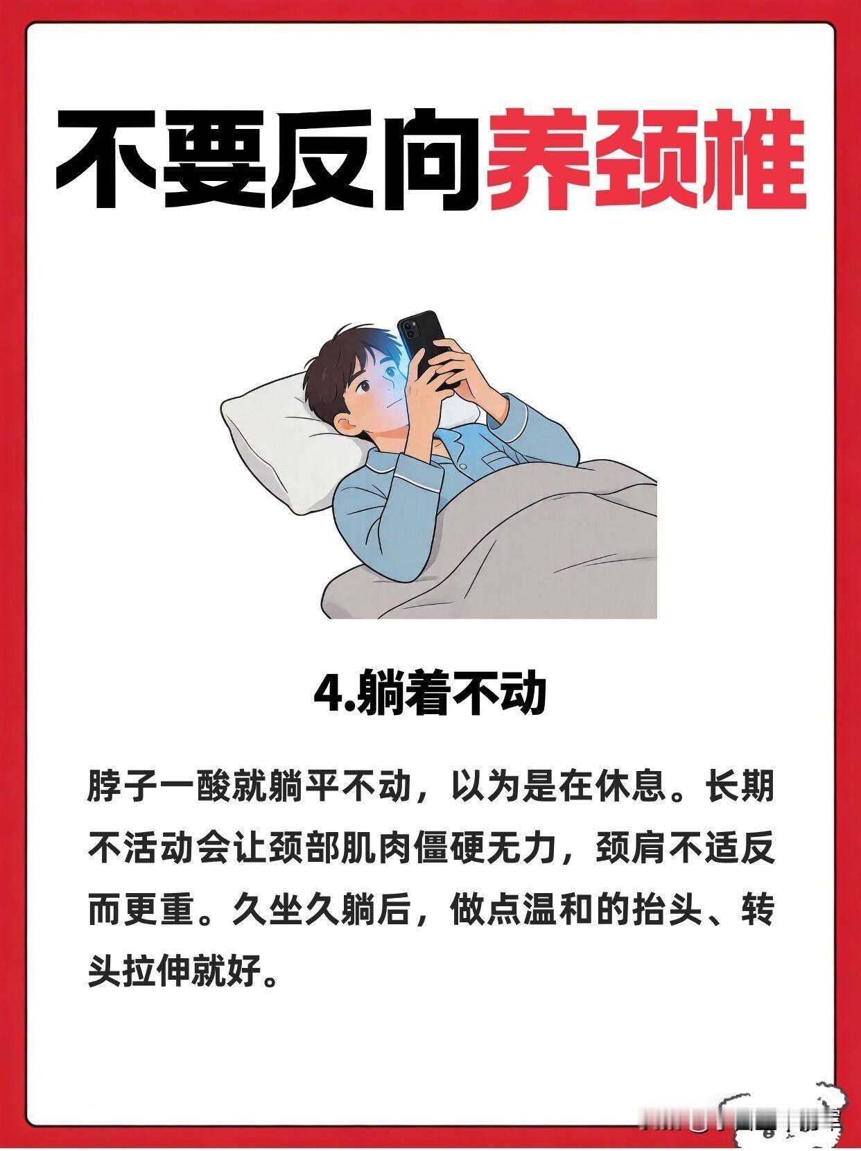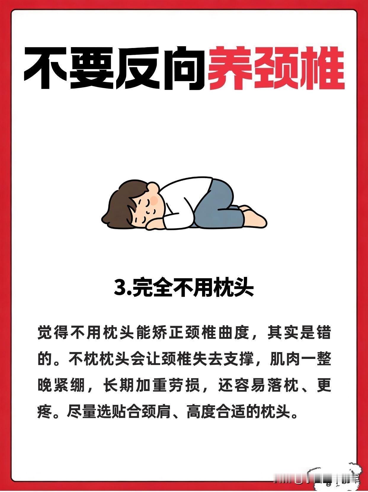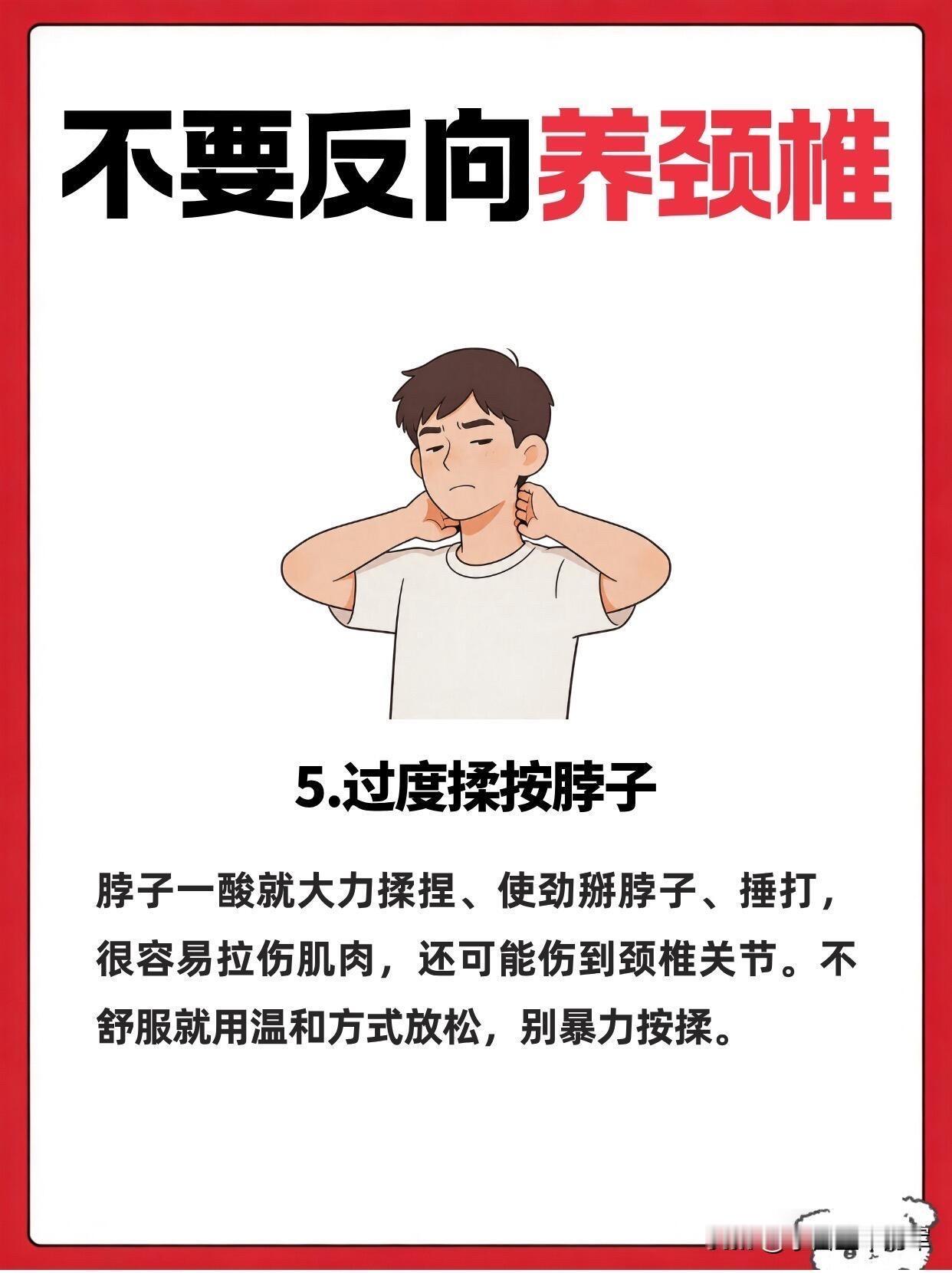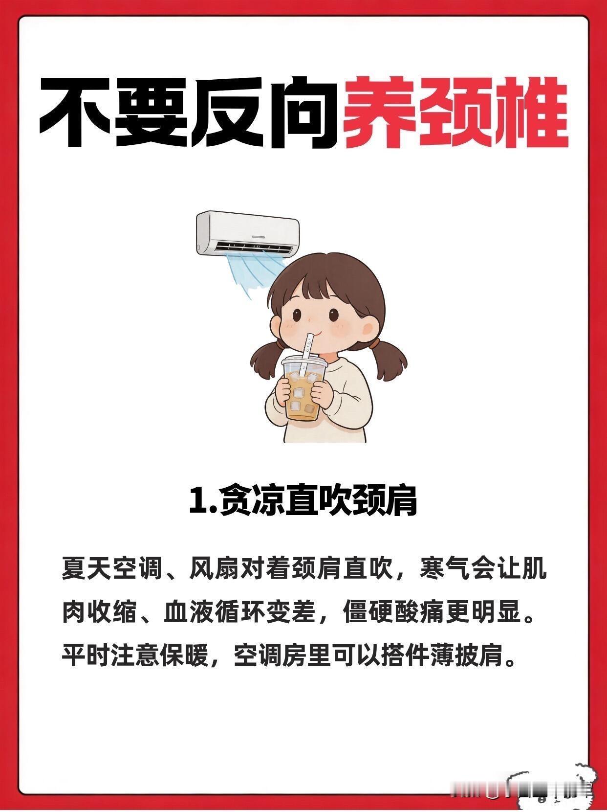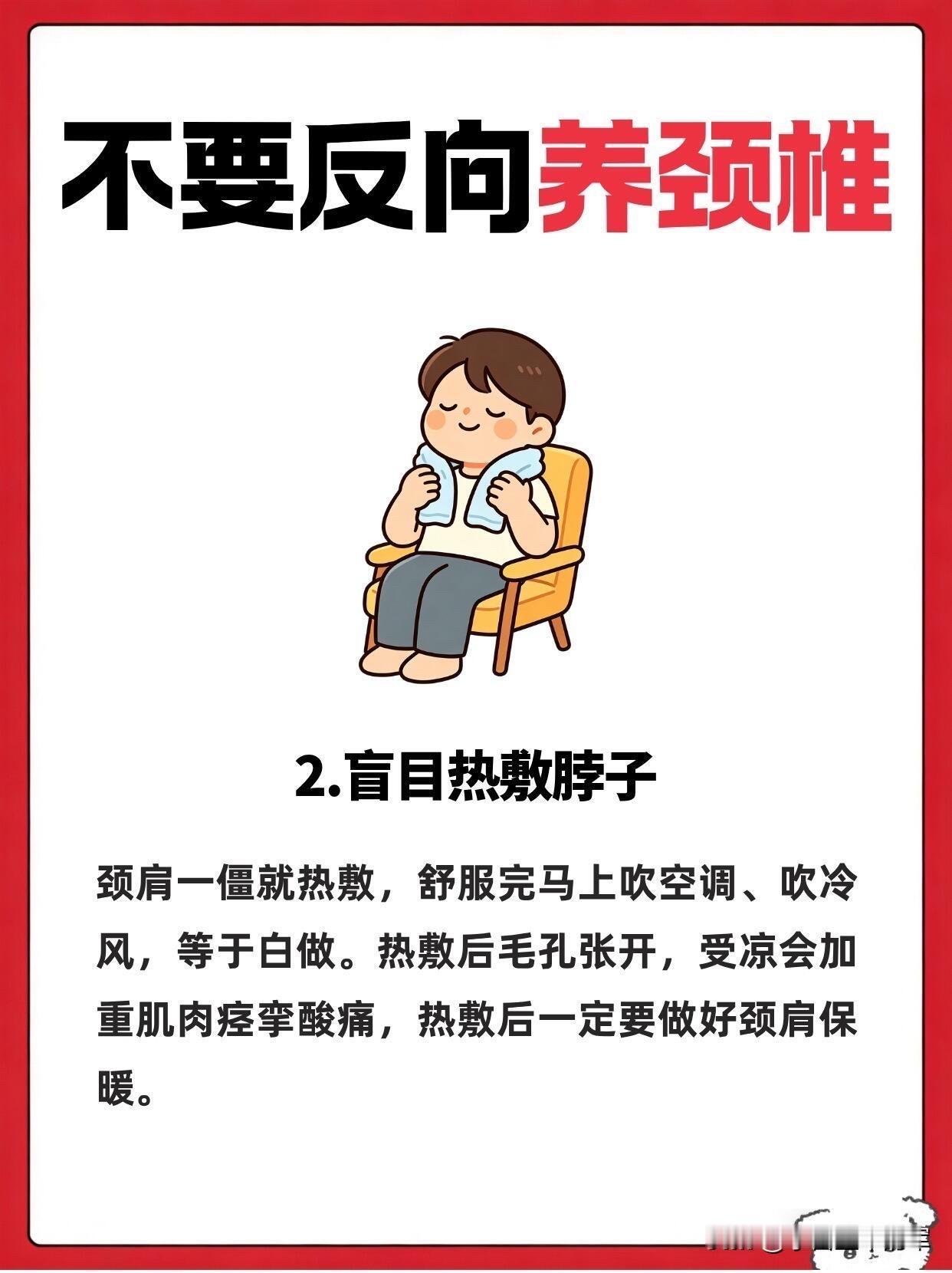 别再反向养颈椎了!这5个坑我全踩过 谁懂啊家人们,我之前就是妥妥的“反向养颈椎”大户,脖子酸了就躺平、对着空调直吹,结果越养越僵,去推拿才知道自己踩了多少雷。 第一个坑就是贪凉直吹颈肩,夏天空调风对着脖子吹,当时爽到飞起,转头就僵得动不了。寒气让肌肉收缩,血液循环变差,酸痛只会更严重,后来我直接备了个小披肩,空调房里再也不敢裸脖子待着了。 第二个是盲目热敷,每次热敷完舒服没两分钟,转头就扎进空调房,毛孔张开的时候受凉,肌肉痉挛只会加重,白忙活一场。 第三个是不用枕头睡觉,总觉得能矫正颈椎曲度,结果脖子整晚悬空,肌肉绷得紧紧的,第二天落枕更严重,选个贴合颈肩的枕头才是真的舒服。 第四个是脖子一酸就躺着不动,以为是休息,结果躺久了肌肉更僵硬,后来我每隔一小时就抬头转一转,反而舒服多了。 第五个就是暴力揉脖子,脖子酸了就使劲掰、捶打,差点拉伤肌肉,现在只会轻轻按揉放松,再也不敢瞎用力了。 这些反向操作,很多人都在天天做,难怪颈椎越养越差,快看看你中了几个!
