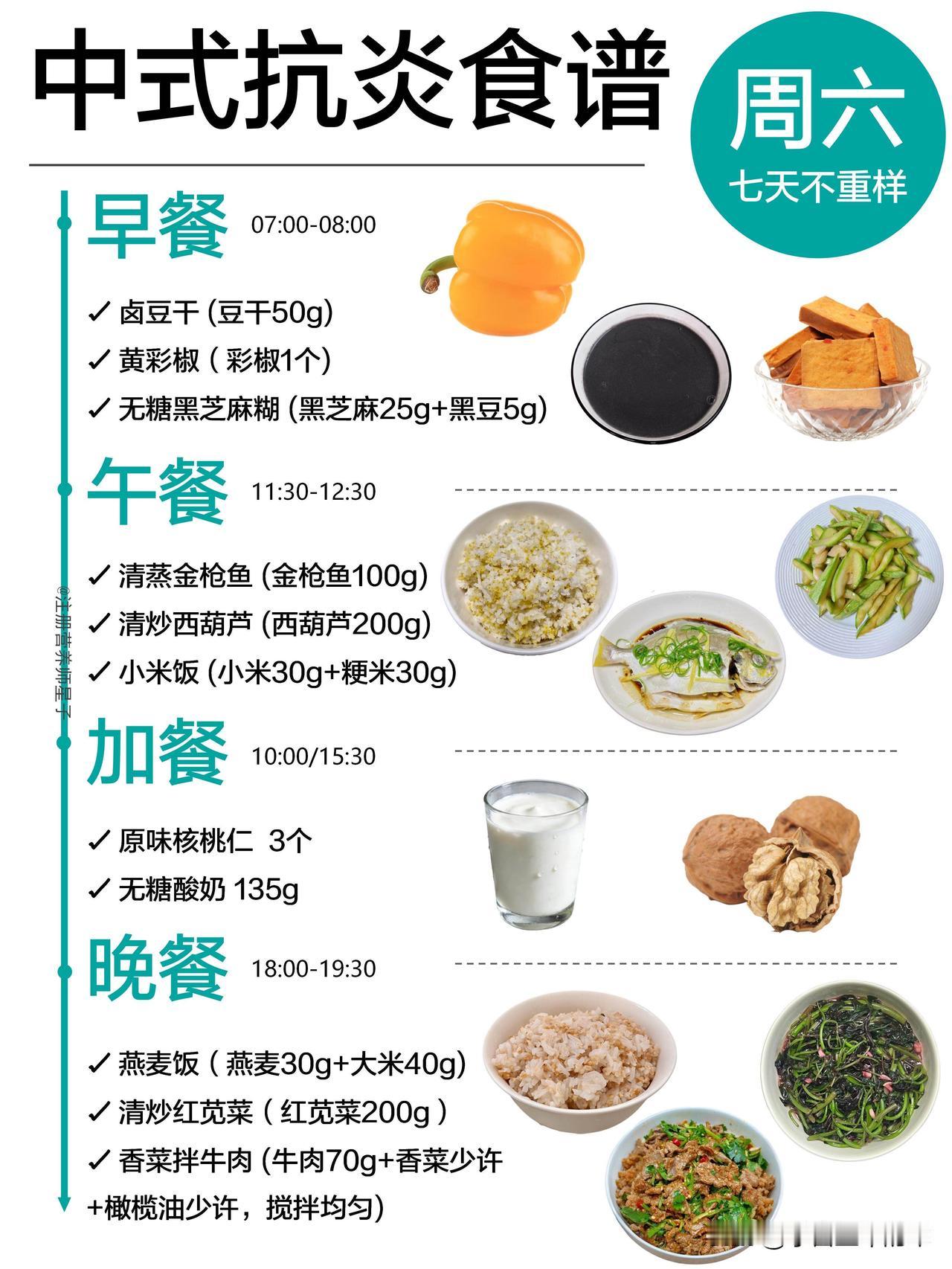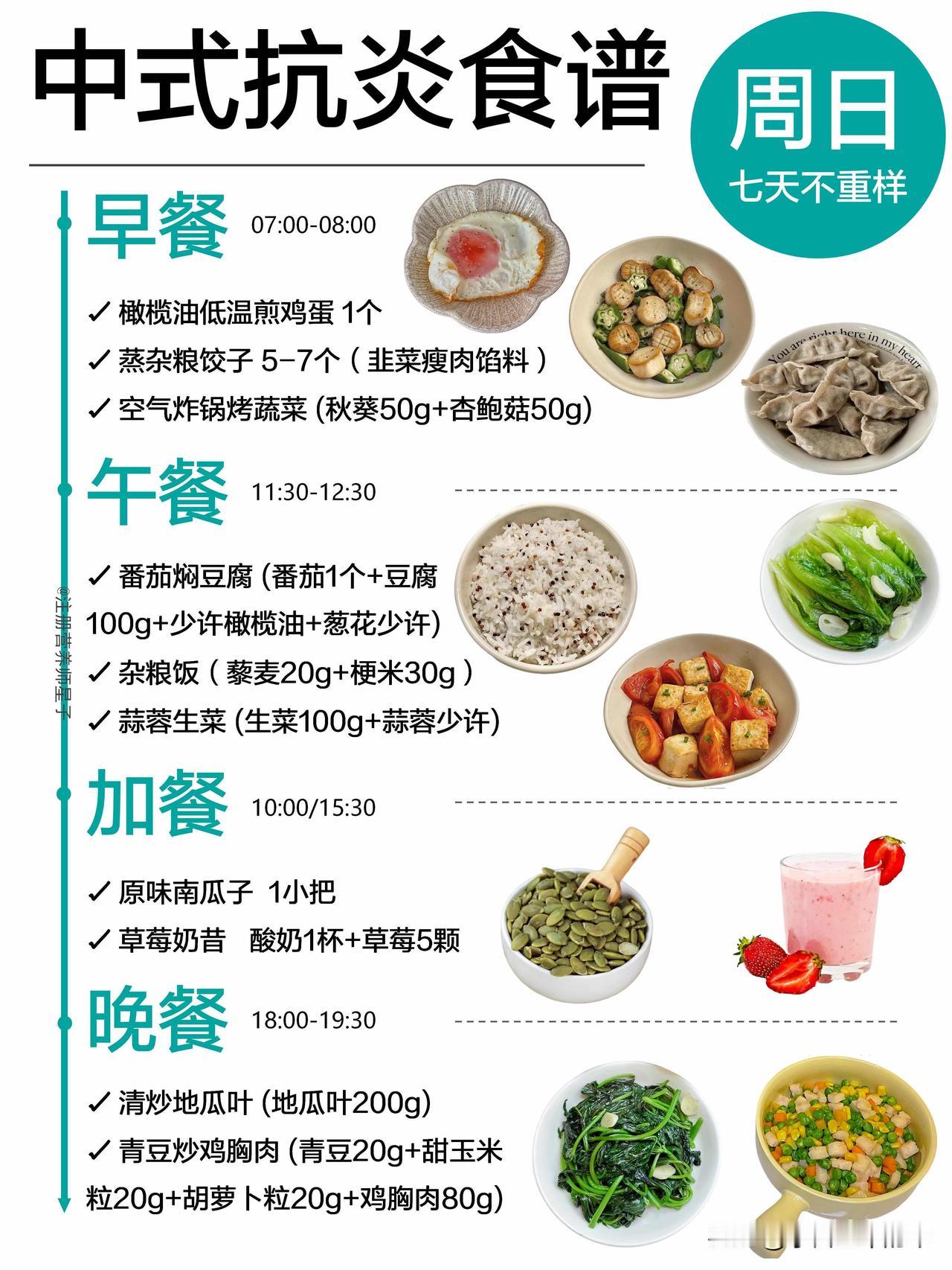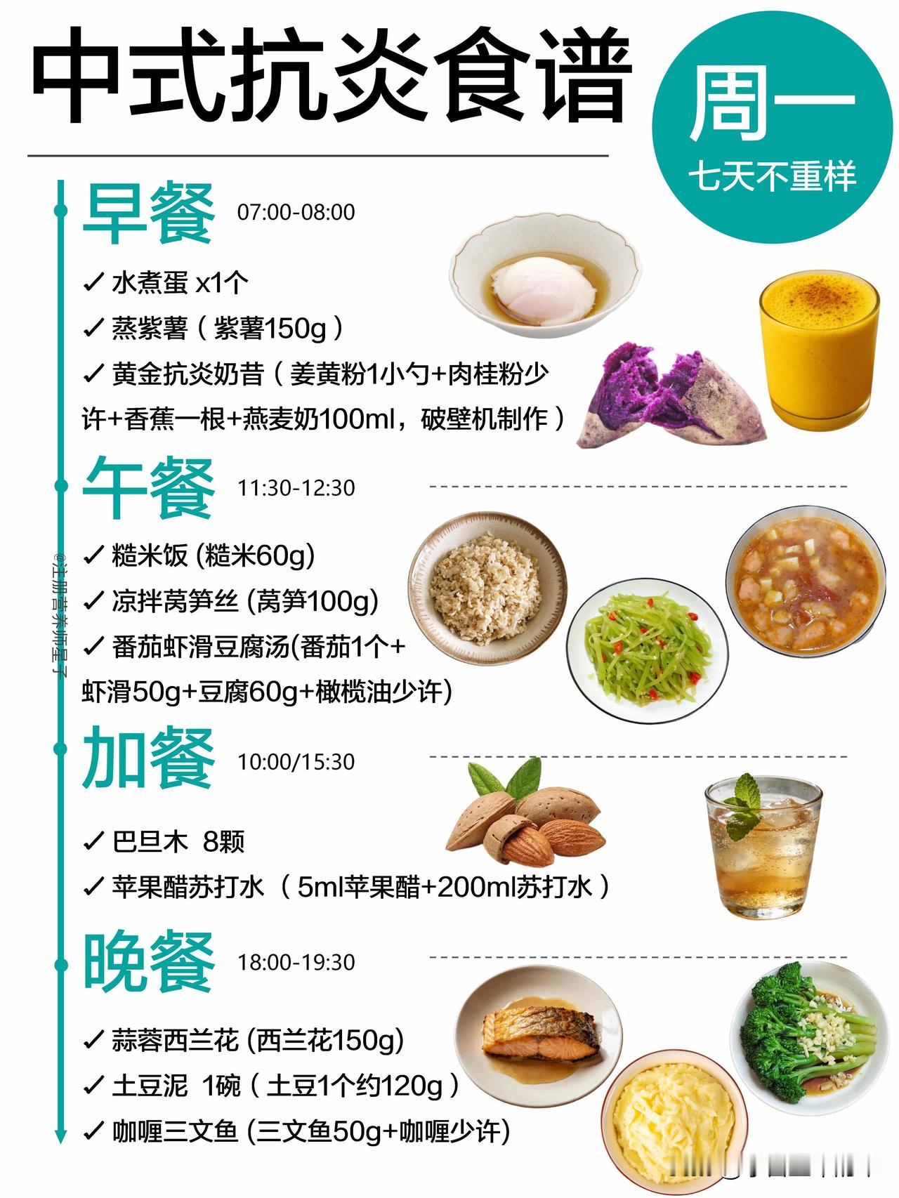 抗炎餐吃对了,皮肤和身体都在悄悄变轻松 谁懂啊,以前总觉得抗炎饮食就是吃沙拉、喝各种难喝的糊糊,直到我跟着这份中式抗炎食谱吃了一周,才发现原来不用啃草也能轻松抗炎。 这份一周不重样的食谱,完全贴合我们的饮食习惯,不用买一堆看不懂的进口食材,菜市场就能凑齐。周一的黄金抗炎奶昔,用姜黄粉和肉桂粉搭配香蕉燕麦奶,喝起来像温暖的香料奶茶,完全没有怪味;周三的五红汤搭配蒸红薯,连姨妈期都能暖乎乎的;周四的荞麦面搭配瘦牛肉,加班晚了吃也没负担。 它的核心就是多吃高纤维的全谷物、深绿色蔬菜和优质蛋白,用橄榄油、亚麻籽油这类健康油脂代替重油重盐,连加餐都安排了巴旦木、核桃这类抗炎坚果,再也不用靠奶茶和零食续命。 吃了一周下来,最明显的变化就是早上起来脸不肿了,之前因为炎症反复冒的小痘痘也消了大半,连下午犯困的情况都少了很多。不用极端节食,也不用追求“干净到苛刻”,好好吃饭,身体真的会给你正向反馈。
