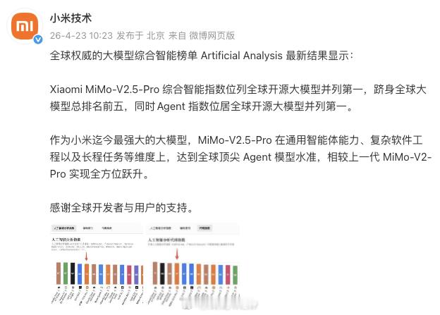 小米MiMo-V2.5-Pro直接把国产大模型的天花板捅破了,在全球开源大模型里并列第一、总榜前五、Agent指数开源第一。更震撼的是实测,北大编译原理项目,研究生要数周,它4.3小时零bug满分跑完,自诊断自修复,做项目快且0错误,有这个辅助,导师肯定要乐开花。而且即将开源+全系列公测,不藏着掖着,把顶尖能力开放给全球开发者,这才是中国AI的格局。小米首次登顶全球开源大模型第一