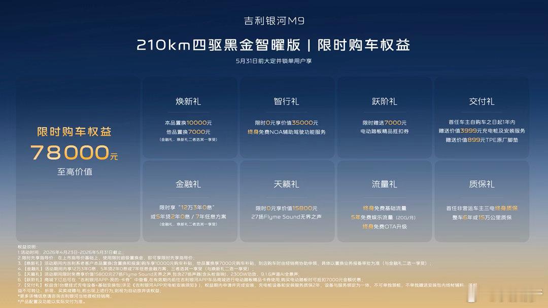 吉利银河M9 黑金智曜版,也就是高定版上市了限时售价25.98万元起,价格还是依然这么优惠吉利银河M9高定版来了大v聊车