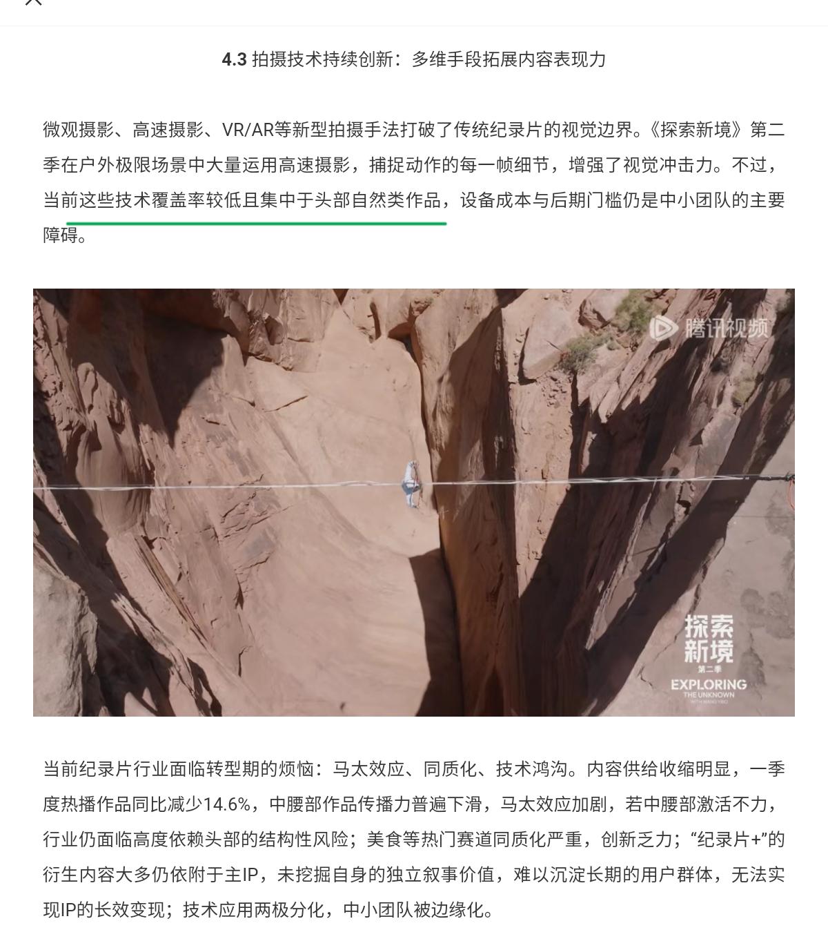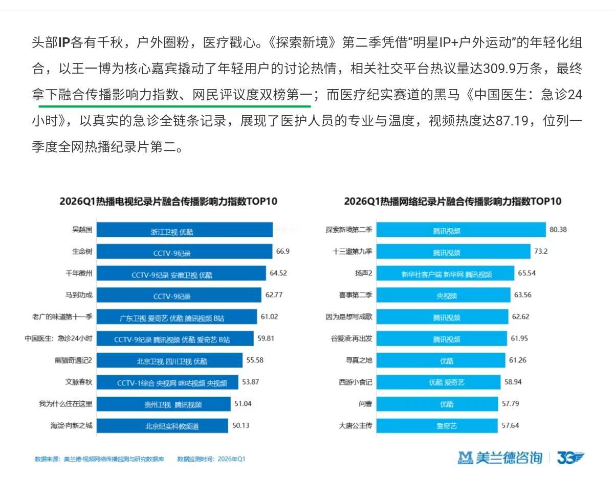 “纪录片创新行动计划”战略高度与“剧美中国”并行。2026第一季度纪录片市场观察,《探索新境》第二季凭借“明星IP王一博+户外运动”的年轻化组合,撬动年轻用户的讨论热情,拿下融合传播影响力指数、网友评议度双榜第一。 网络平台的各自纪录片特色:腾讯依靠《探索新境》系列实现了年轻化表达与口碑的双赢。 《探索新境》大团队大制作,大量运用新型拍摄技术,增强视觉冲击力。 划重点:《探索新境》是纪录片的头部IP,方方面面都是。